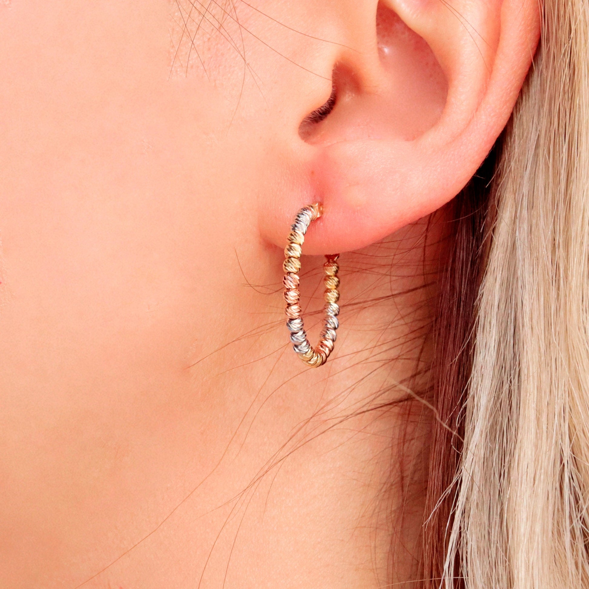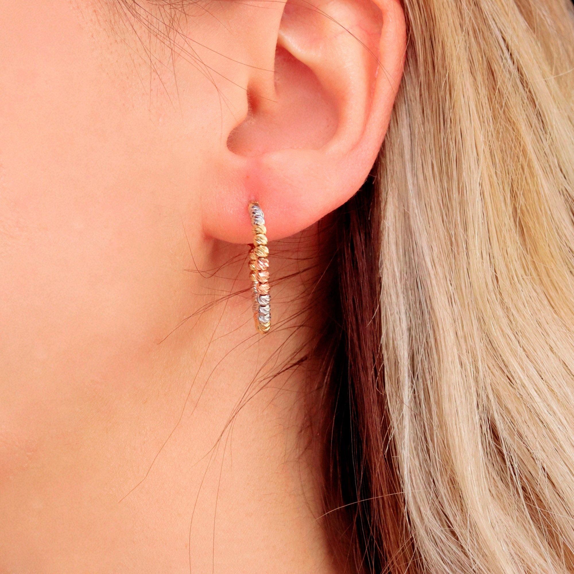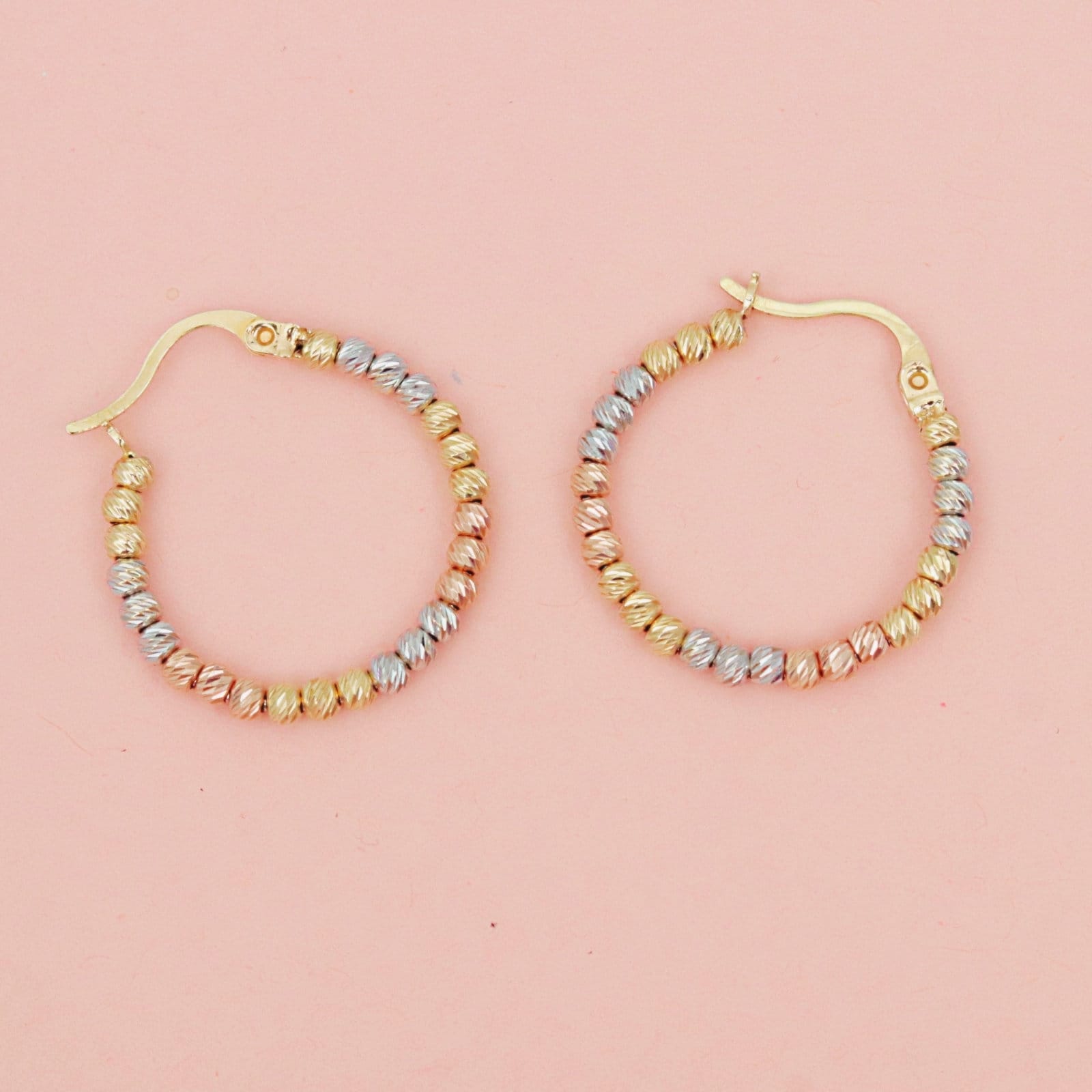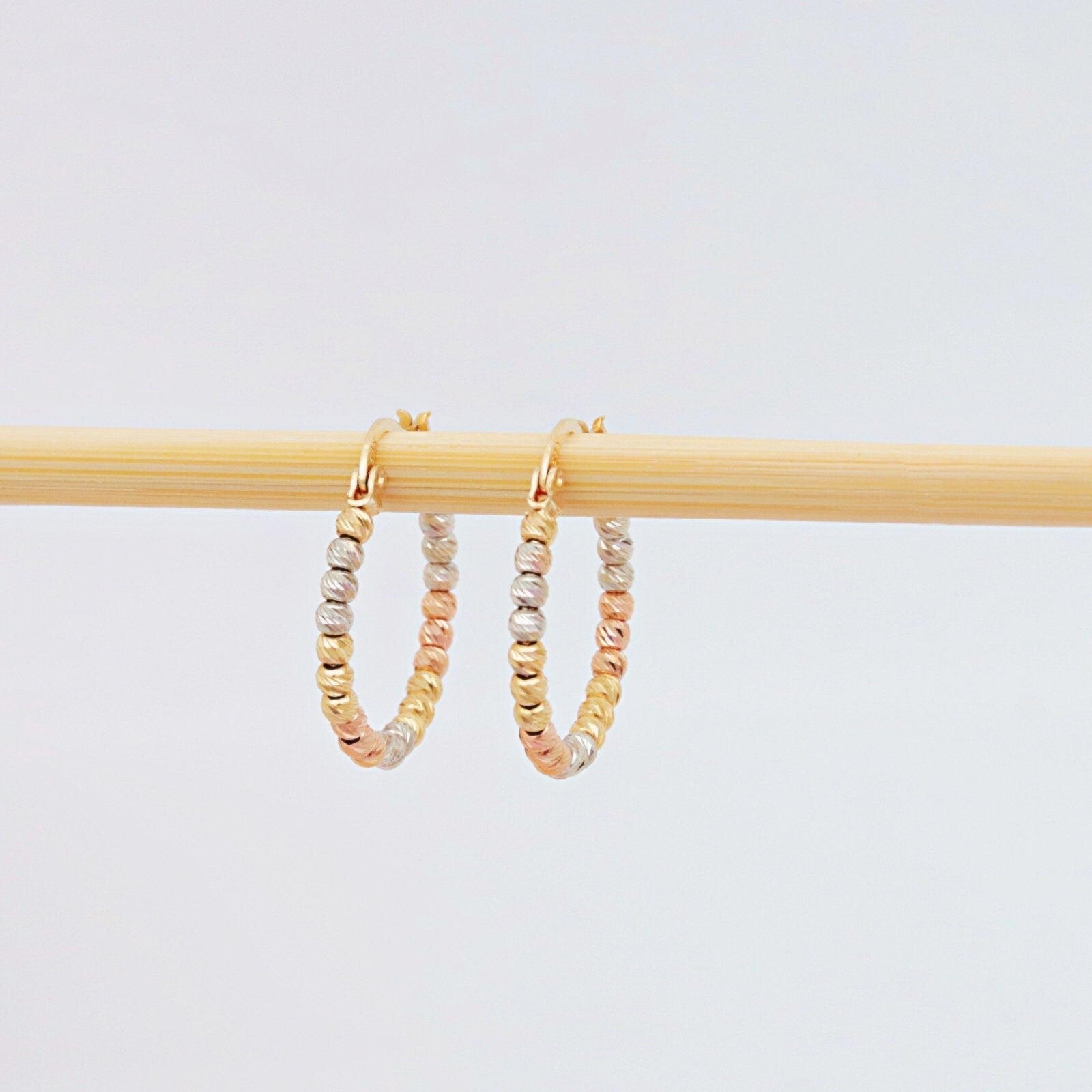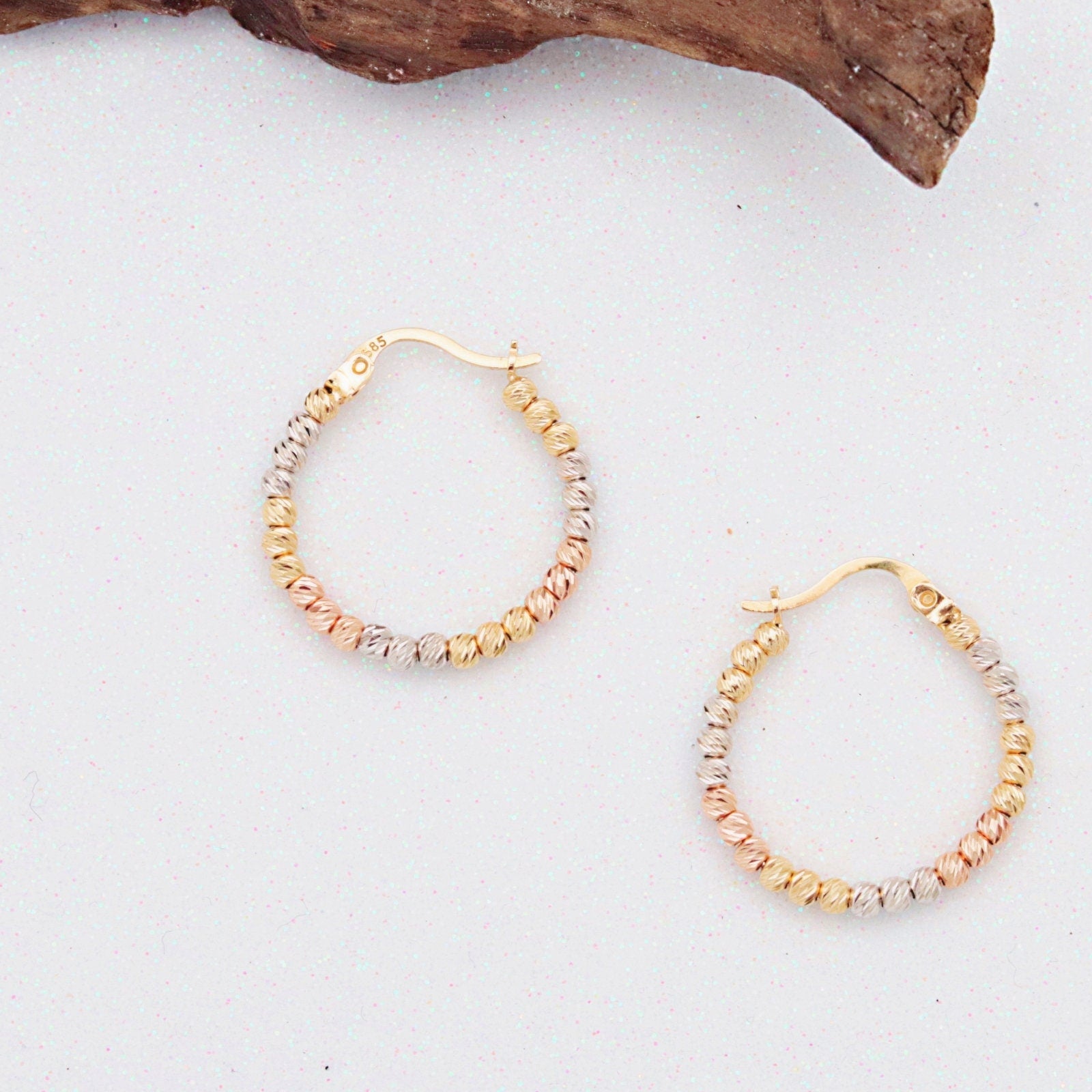 Upgrade your jewelry collection with our 14K Solid Gold Beaded Hoop Earrings. Featuring delicate ball-shaped beads and a unique three-color design, these huggie hoops add a touch of elegance and sophistication to any outfit.