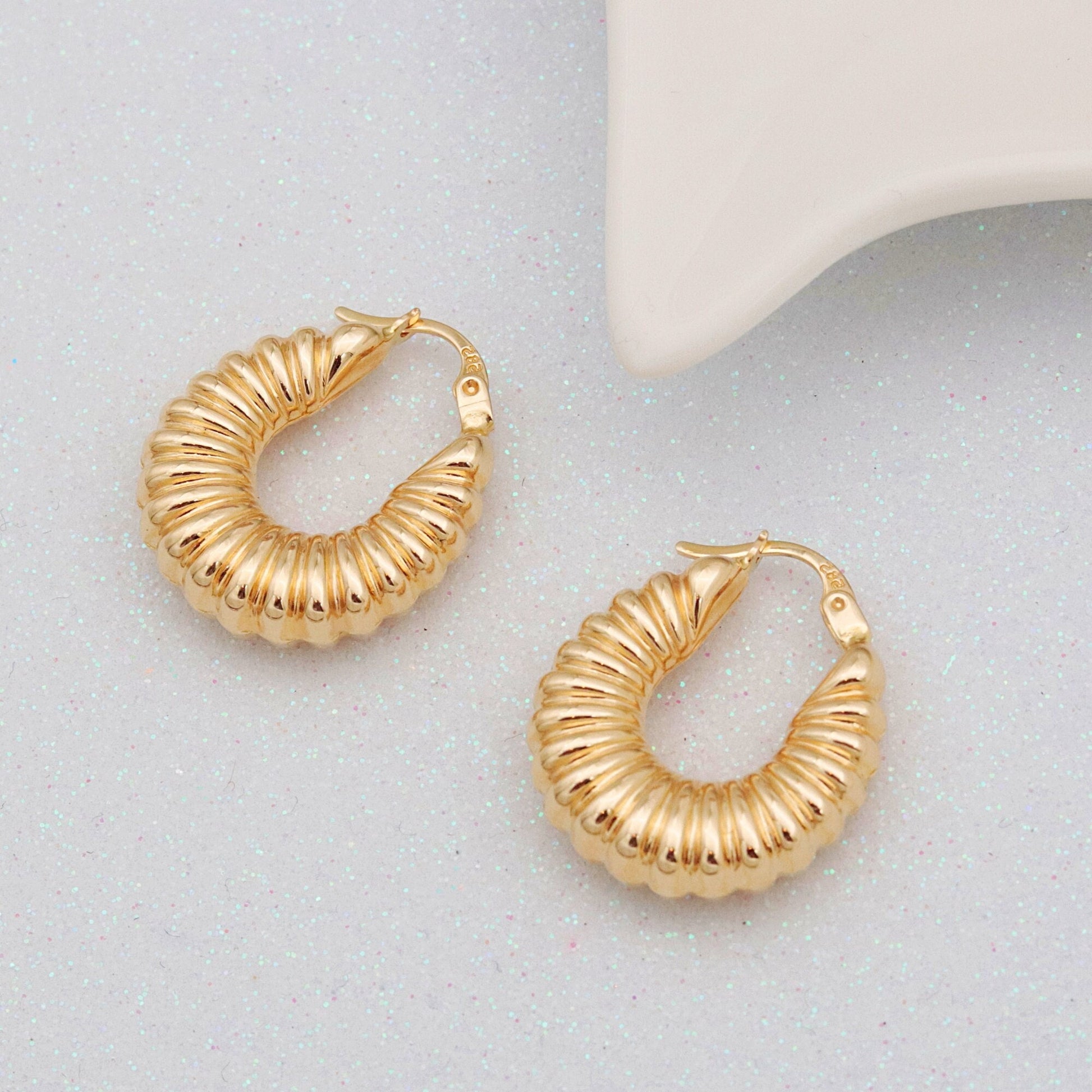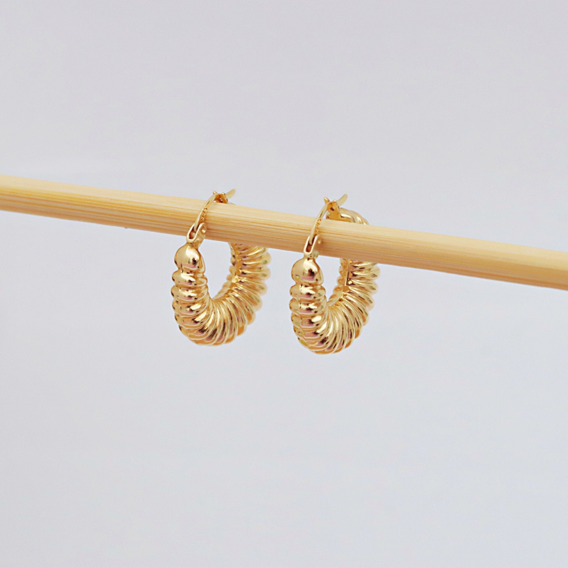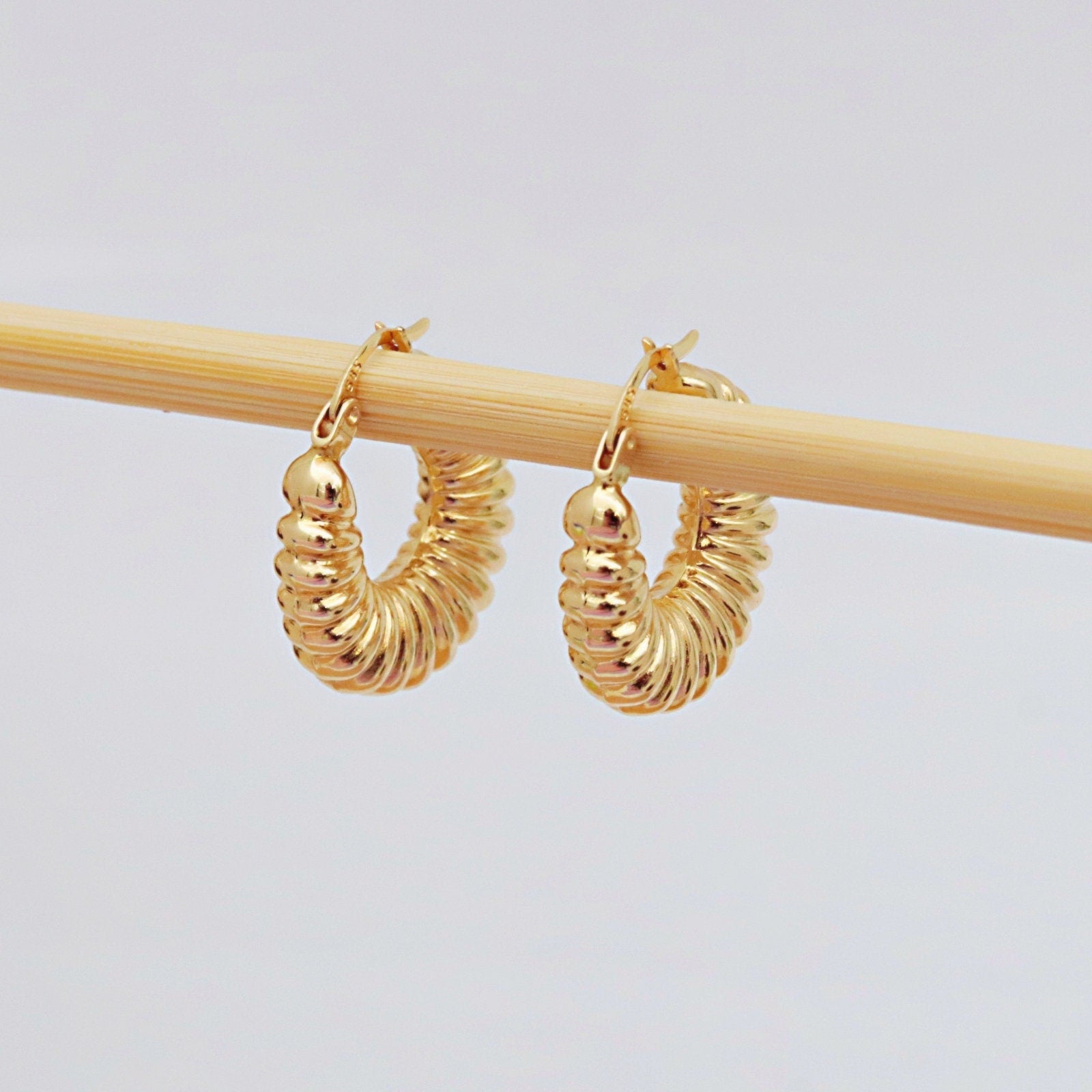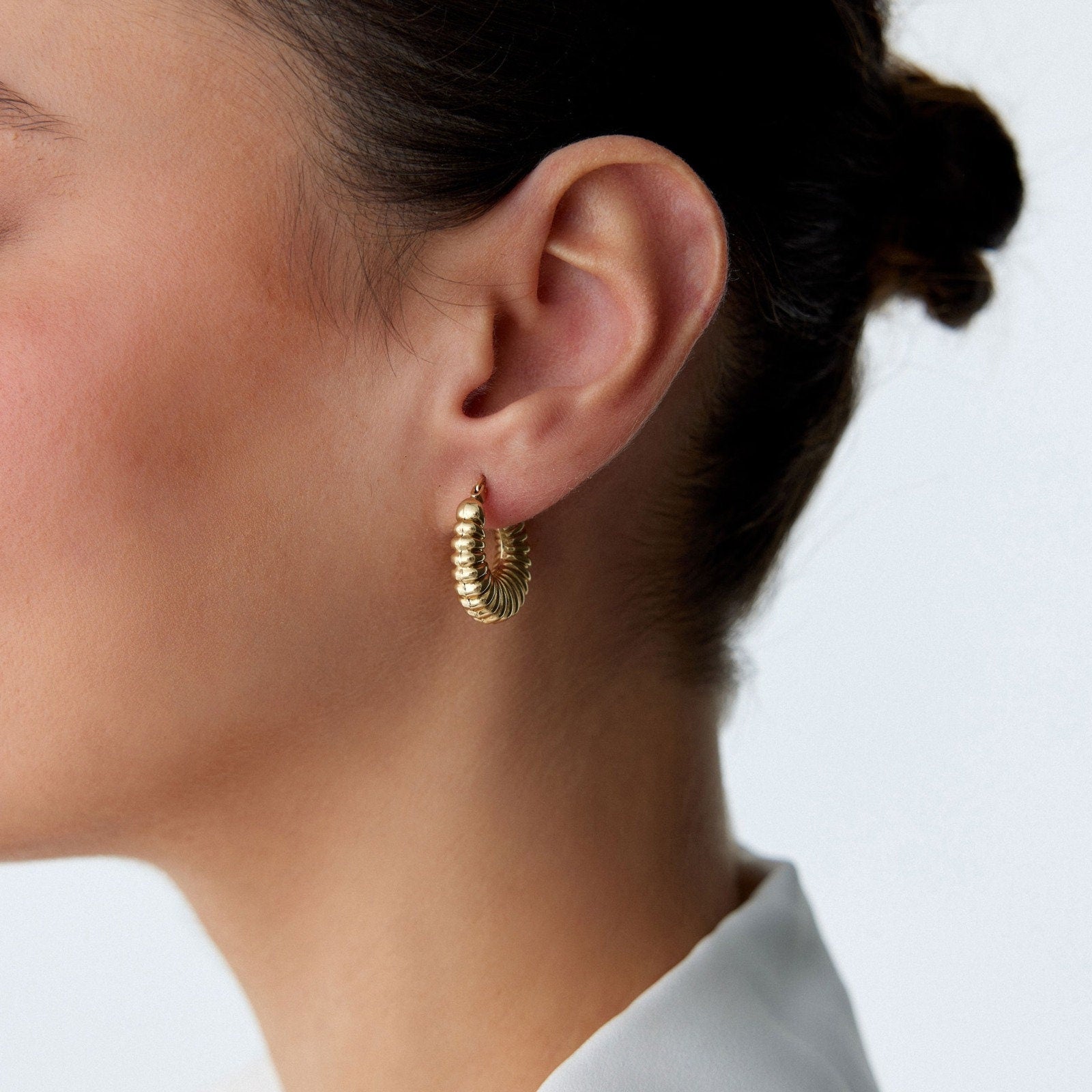 These bold yet elegant chunky hoops make a luxurious statement with their croissant-inspired, twisted design. Crafted entirely from 14K solid gold (not plated or vermeil), these earrings are perfect for special occasions or elevating your everyday style. Choose from yellow gold, rose gold, or white gold to suit your personal taste.