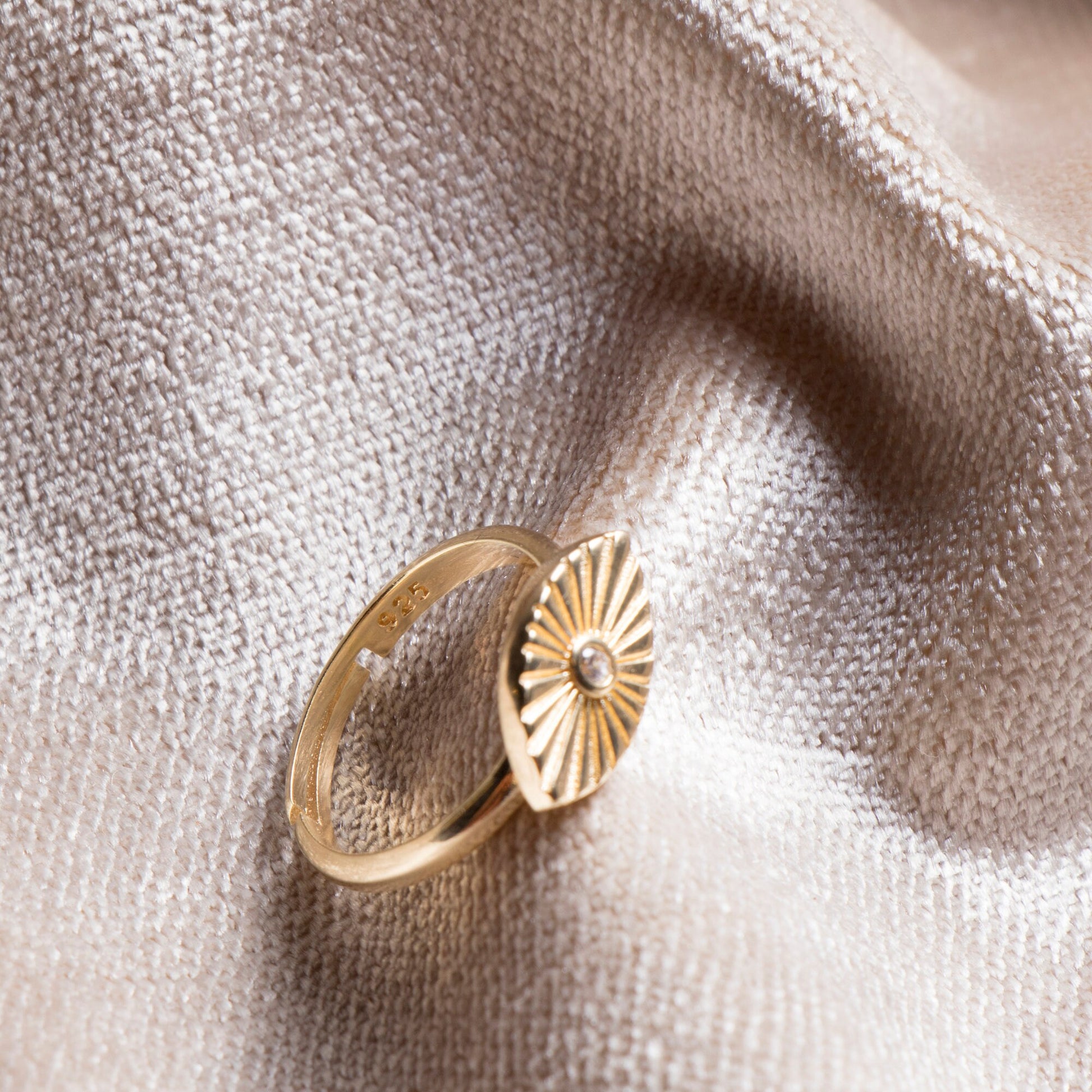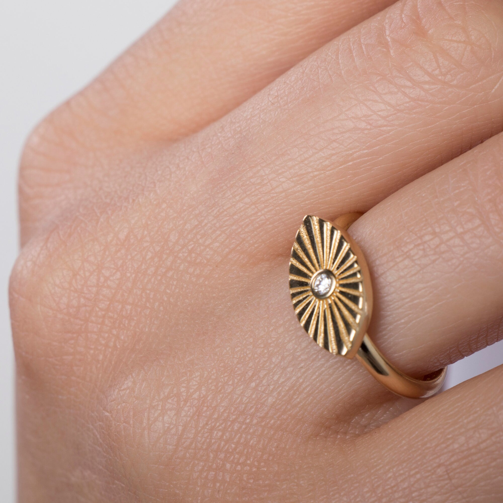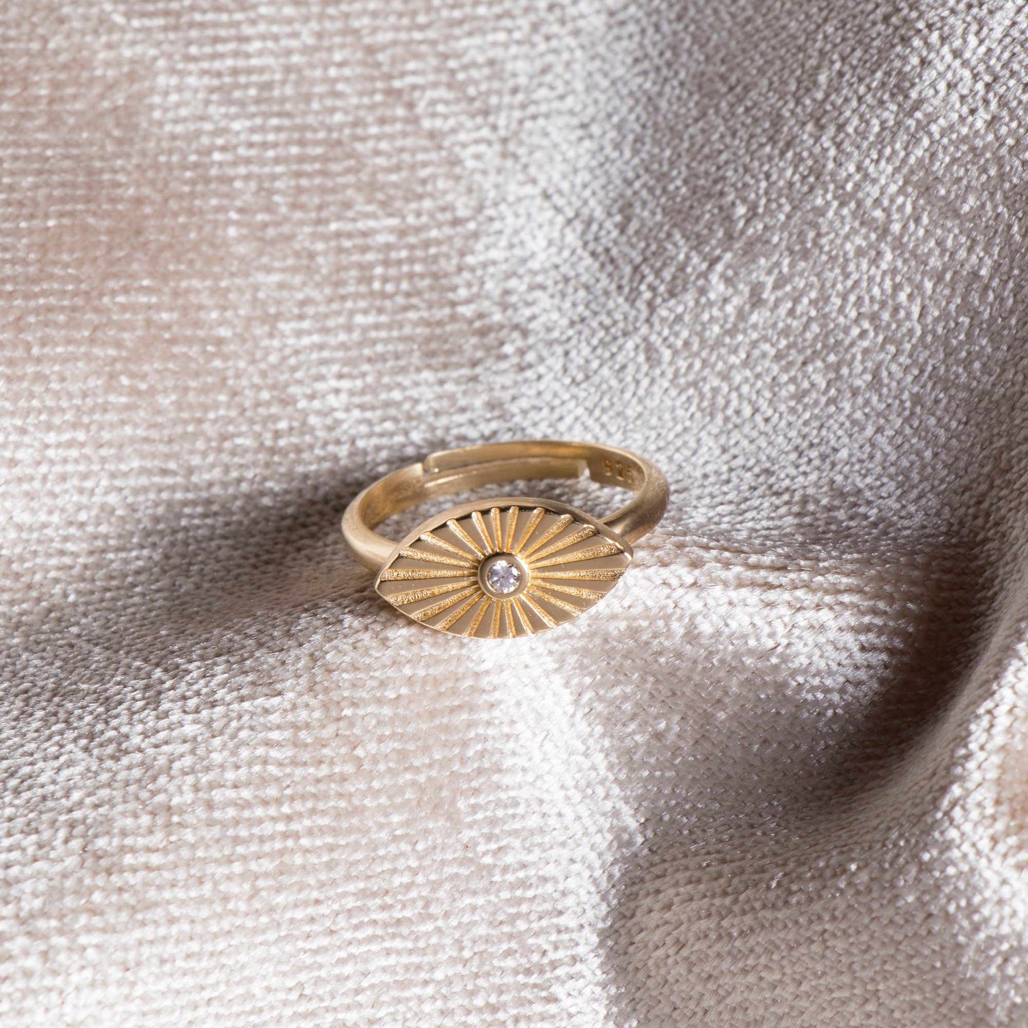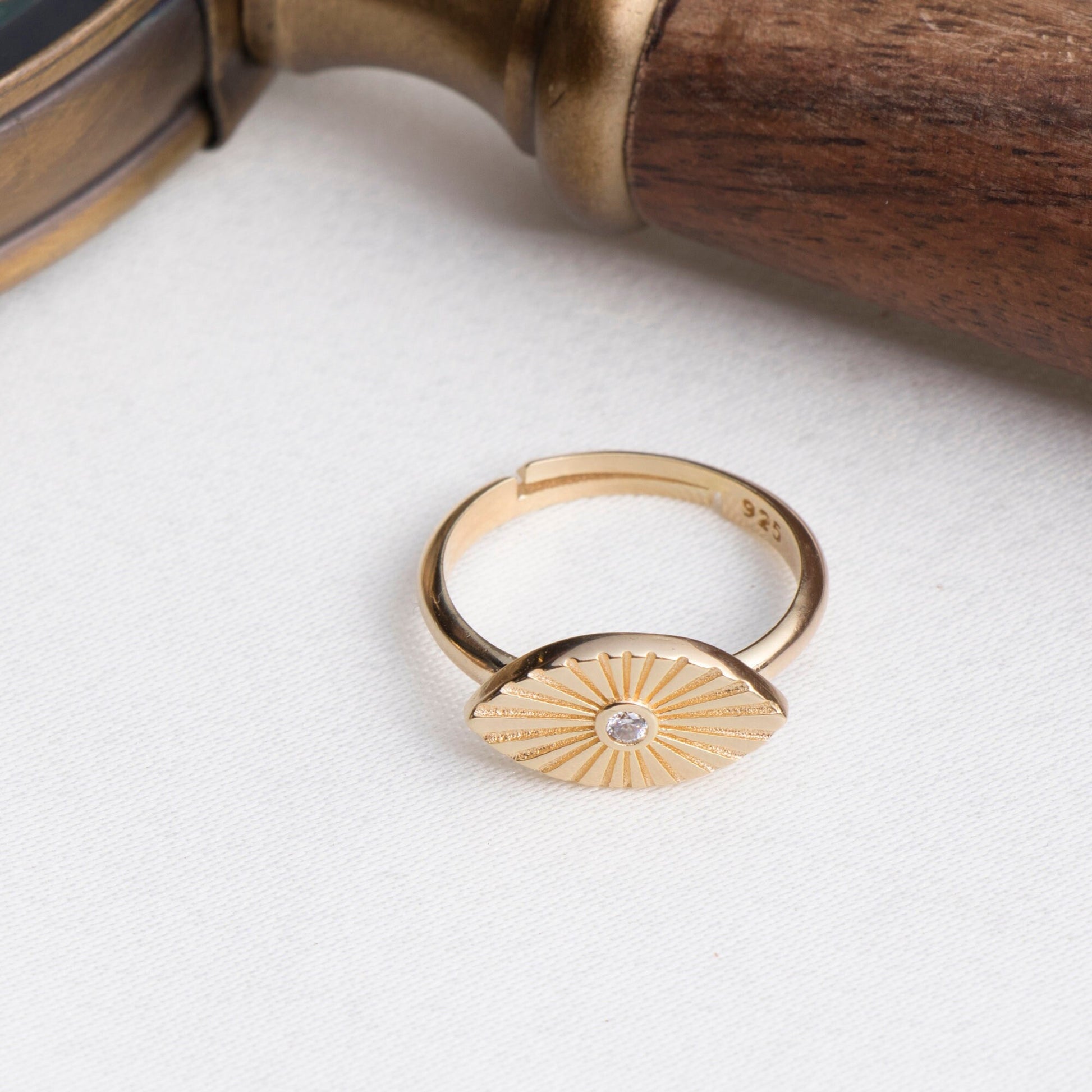 Our new dainty evil eye signet ring. ★1 YEAR WARRANTY★ Our products are plated with a thick layer of 14k solid gold on sterling silver (925K) silver, made with a special technique called “vermeil”. All our jewelries are guaranteed for one year against tarnishing and deterioration. Provided that they are protected from water, soap and chemicals, they can be used for many years with their first day appearance. Our products are the best alternatives of solid gold jewelries. Evil Eye Ring, Adjustable Gold Ring, Dainty Evil Eye Ring, Signet Ring Ring Details: • Size: Adjustable • Thick gold layer on top of 925 Sterling Silver base • Nickel free • Hypoallergenic ★ We use a thick layer of 14k solid gold on 925K sterling silver. ★ Each order will be beautifully packaged for gift giving in a jewelry box.