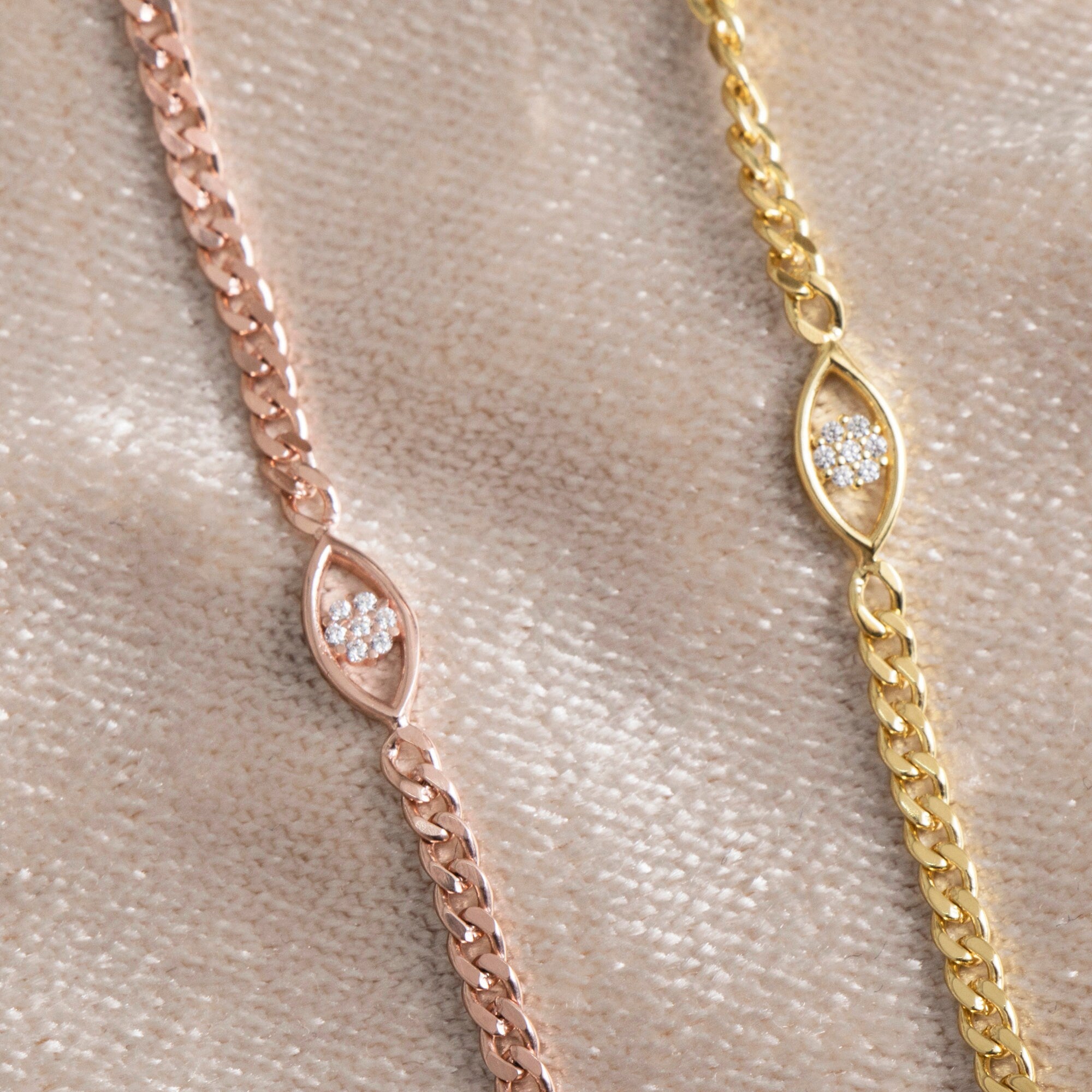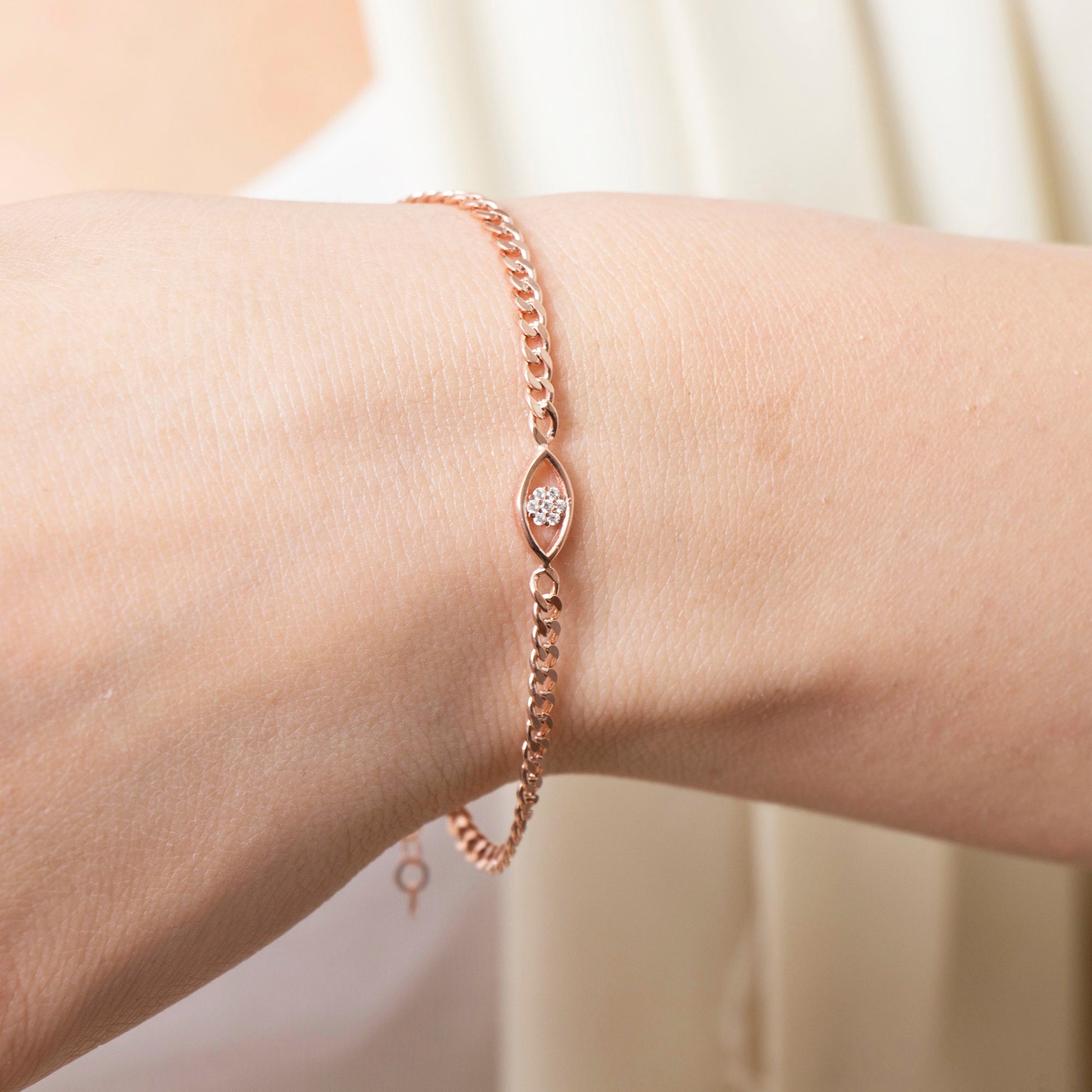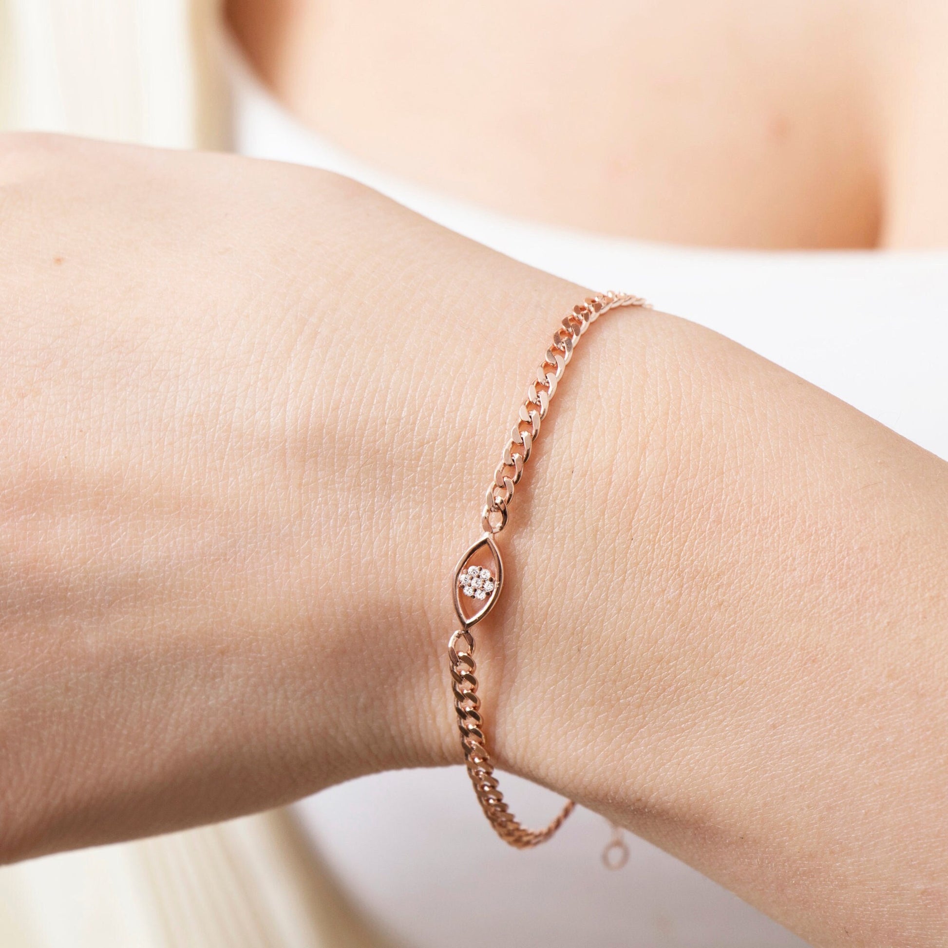Protect and elevate your style with our Gold Evil Eye Bracelet, a delicate and meaningful piece designed to add both elegance and positive energy to your look. Featuring a sparkling cubic zirconia eye charm and crafted in rose gold or yellow gold vermeil, this dainty bracelet is perfect as a protection bracelet, everyday accessory, or thoughtful gift.