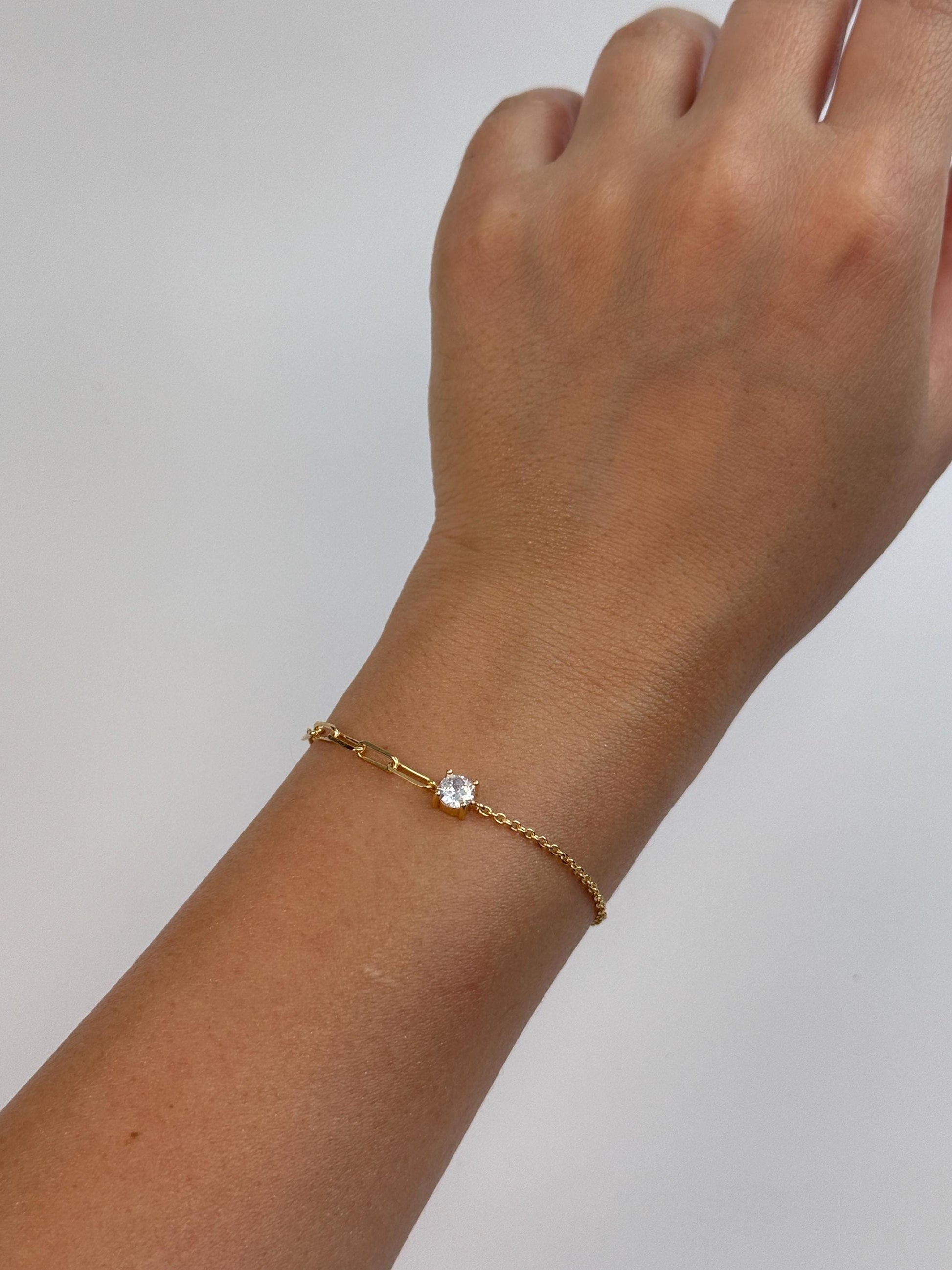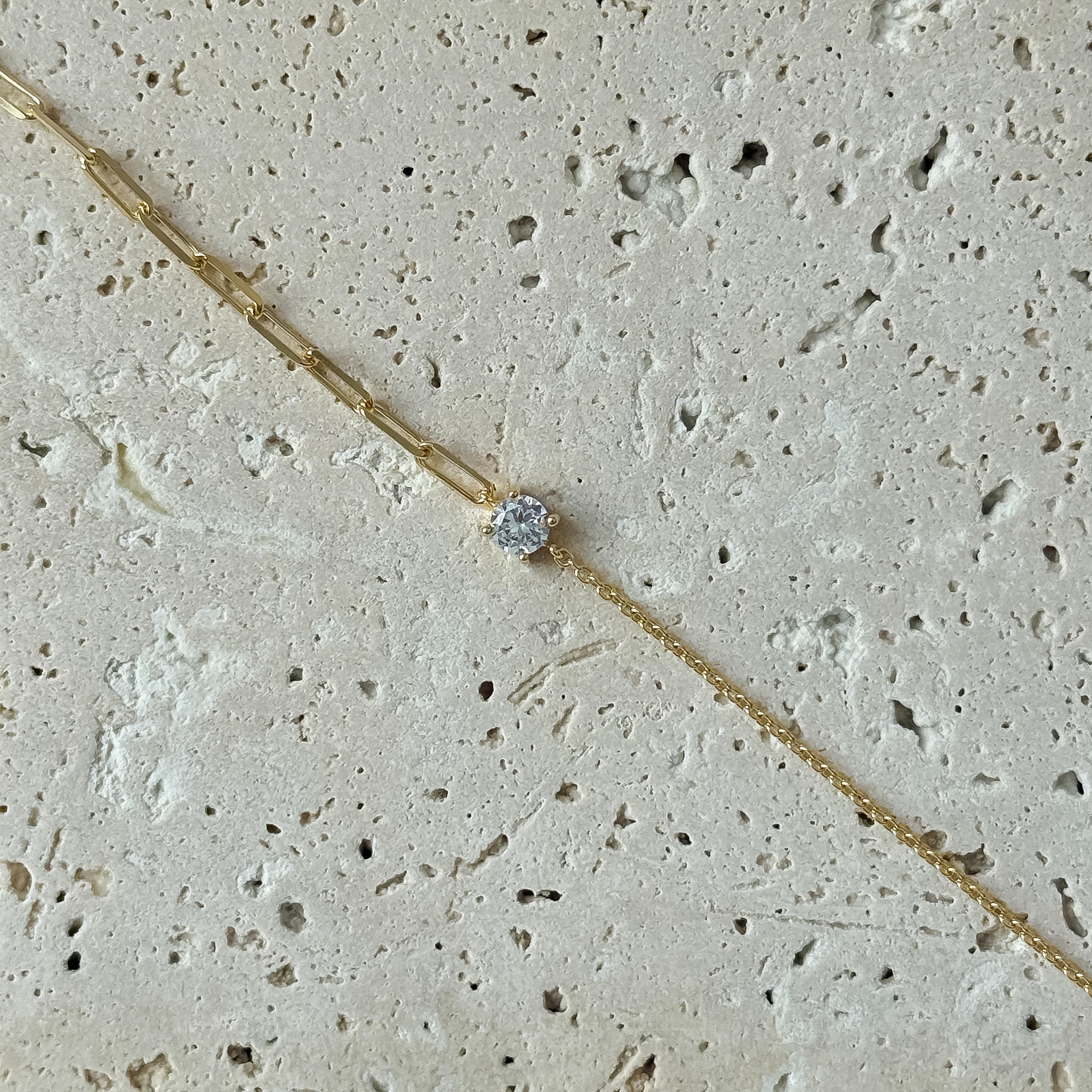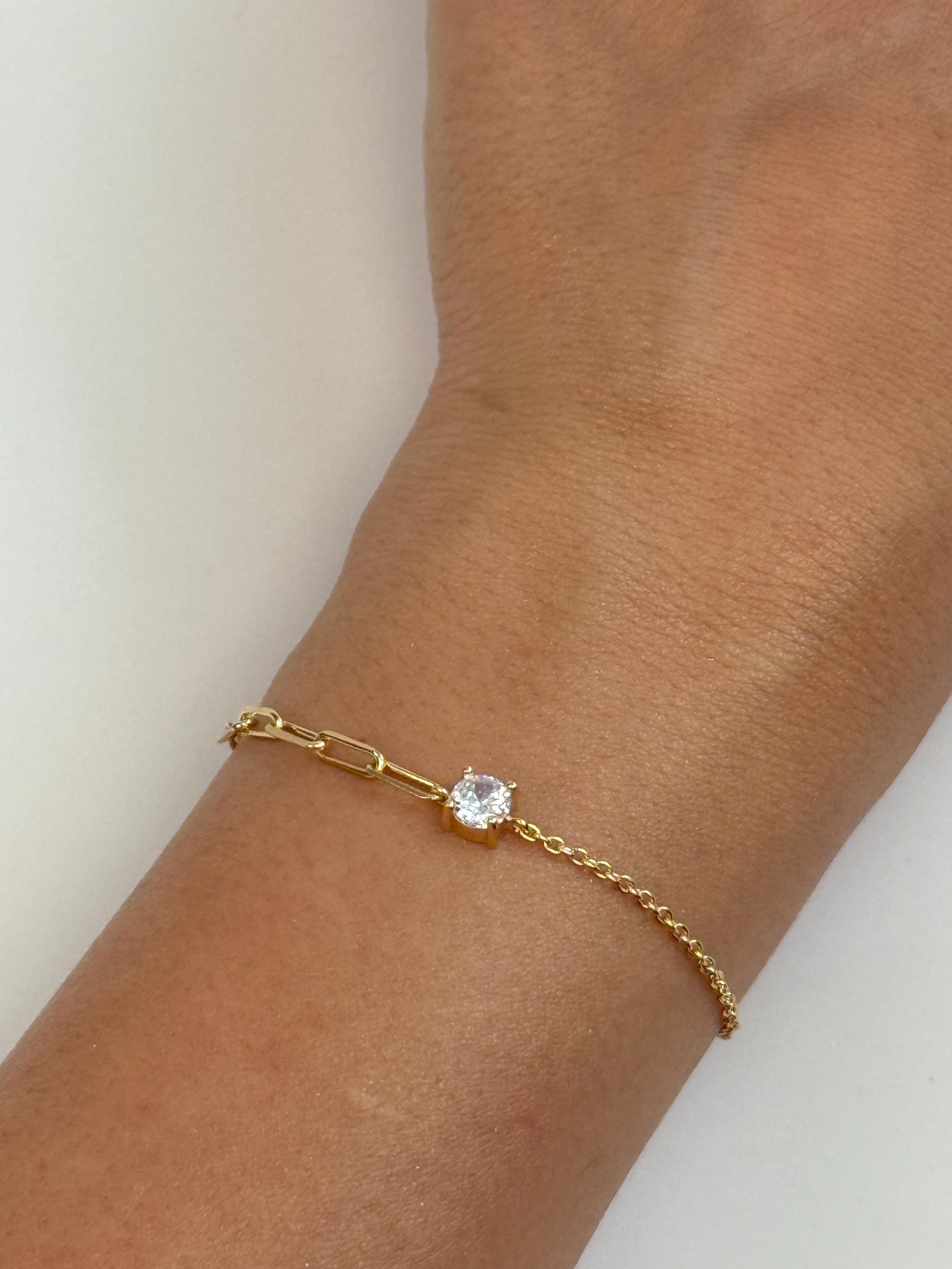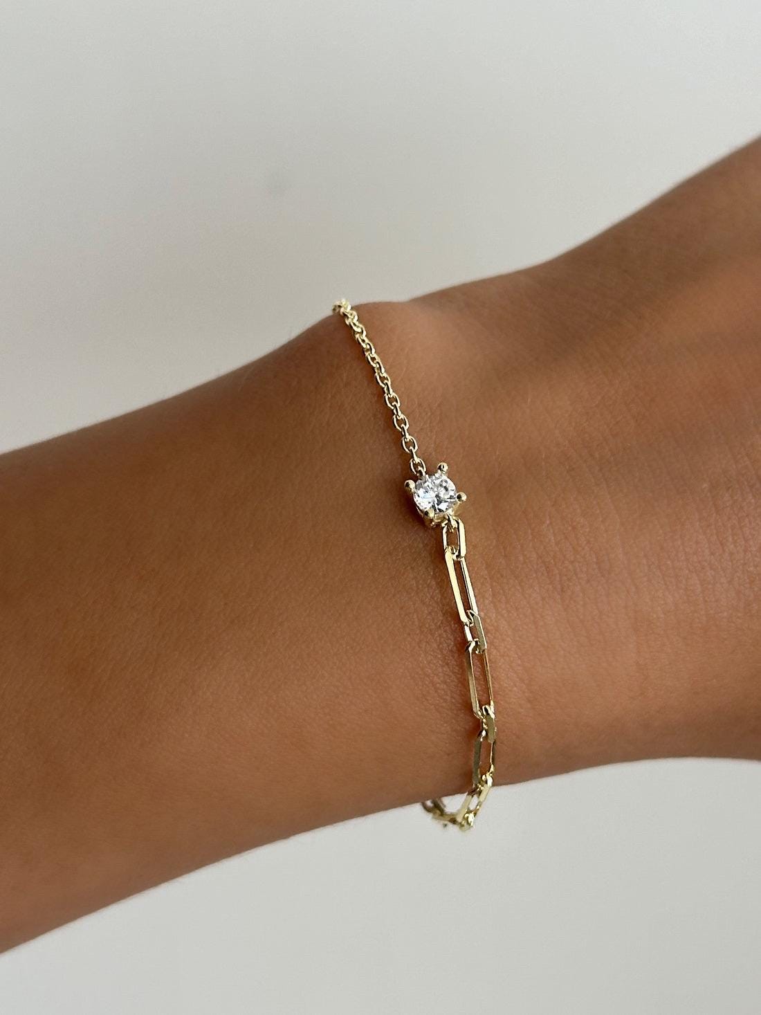 Add timeless elegance to your everyday look with this delicate 14k gold bracelet, featuring a stunning round-cut diamond solitaire and a unique mix of paperclip and cable chain. This minimalist yet eye-catching design is perfect for layering or wearing solo.