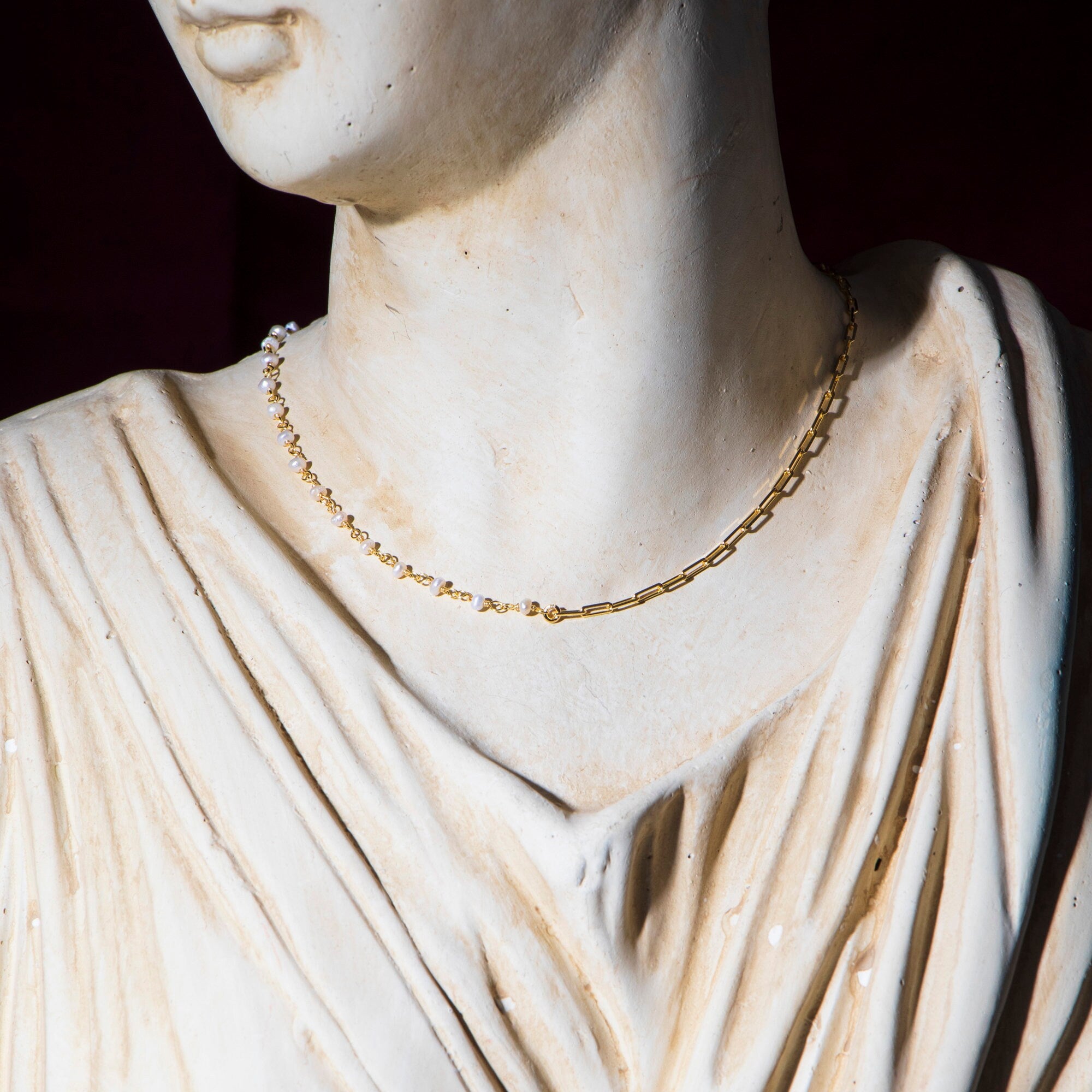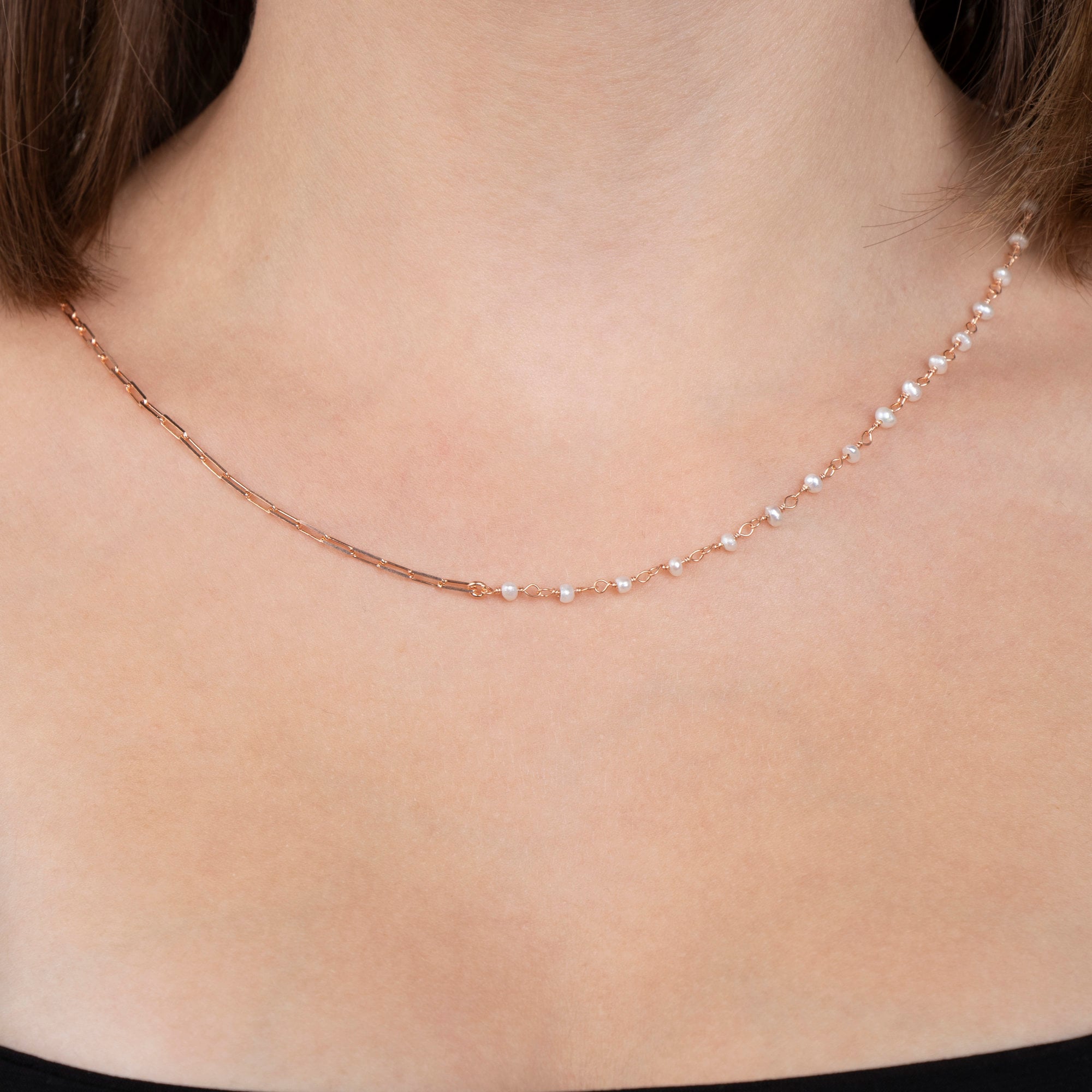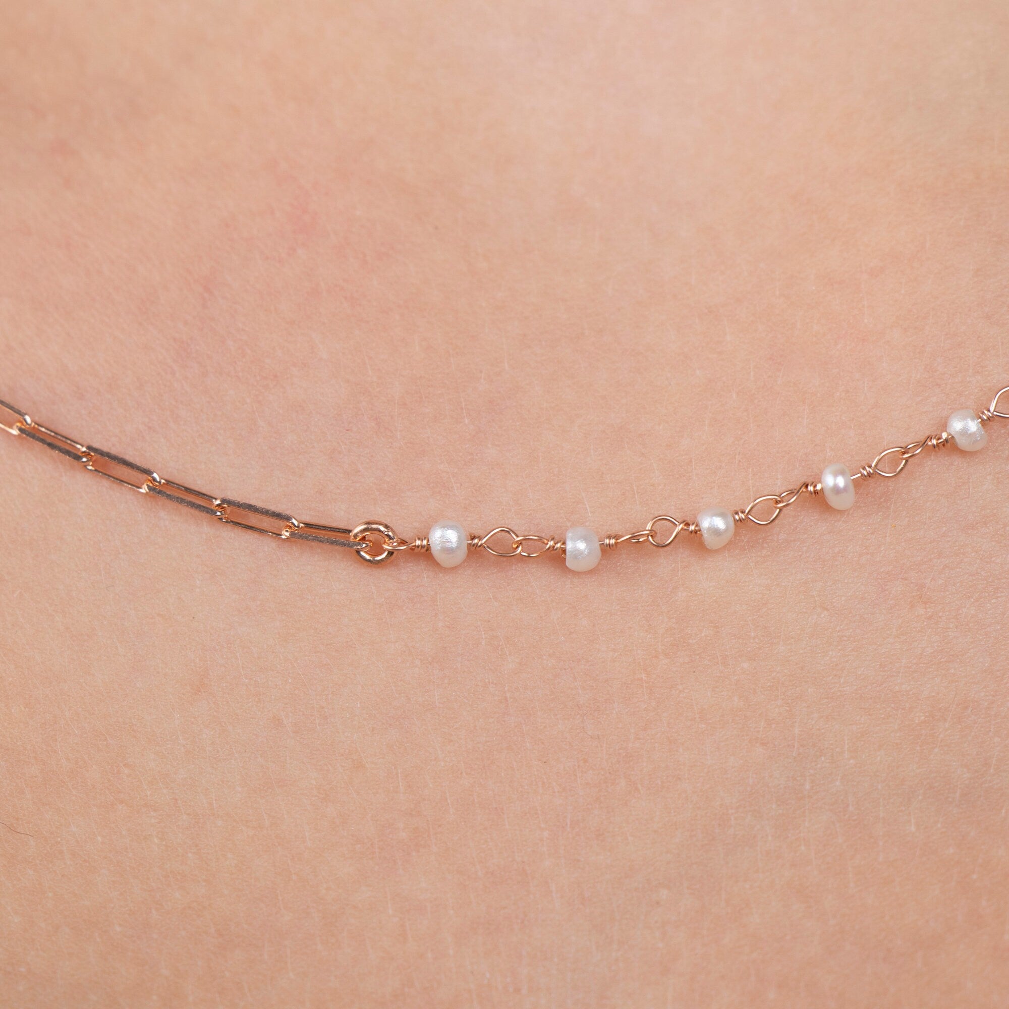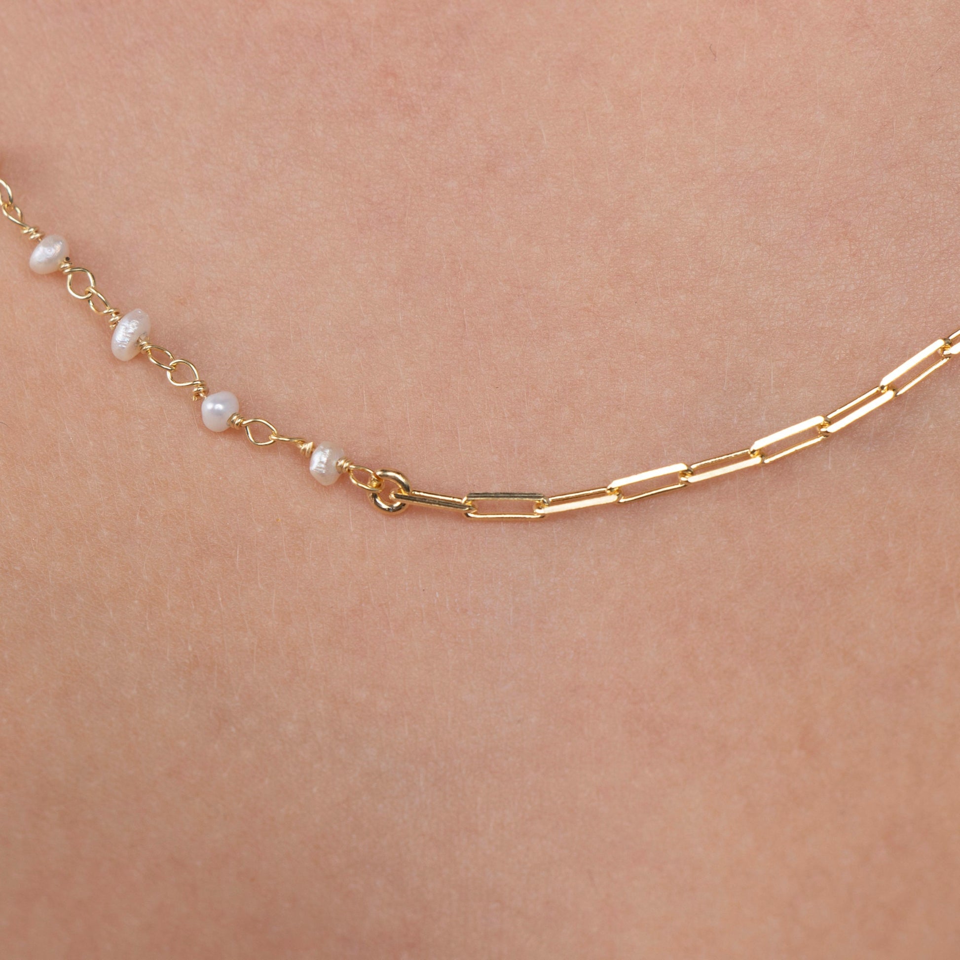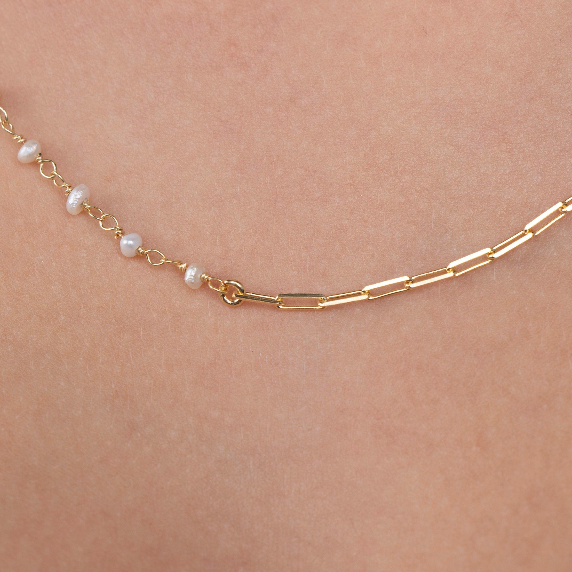 Elegant and dainty, this gold freshwater pearl chain necklace is the perfect blend of modern minimalism and timeless beauty. Featuring lustrous pearls paired with a fine gold chain, this half pearl–half chain design makes a stunning piece to wear solo or layered with your favorite necklaces. A thoughtful gift for weddings, anniversaries, birthdays, or just because.