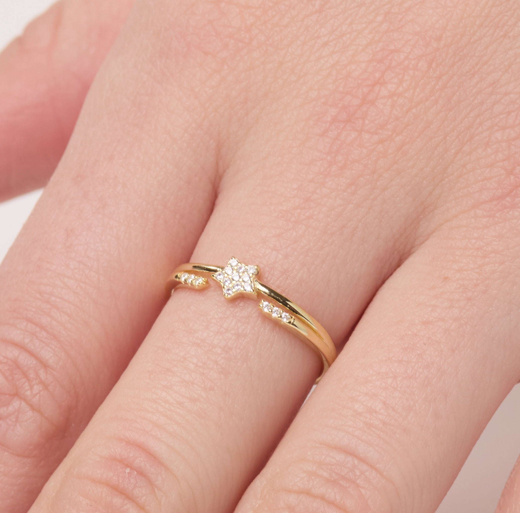 Shine bright with this delicate gold star ring, a beautiful piece for those who love celestial-inspired jewelry. Crafted from genuine 925 sterling silver and plated in a thick layer of 14k gold vermeil, this dainty ring features a sparkling star centerpiece adorned with shimmering cubic zirconia stones. Subtle side accents add extra brilliance, making it the perfect accessory for both everyday wear and special occasions.
