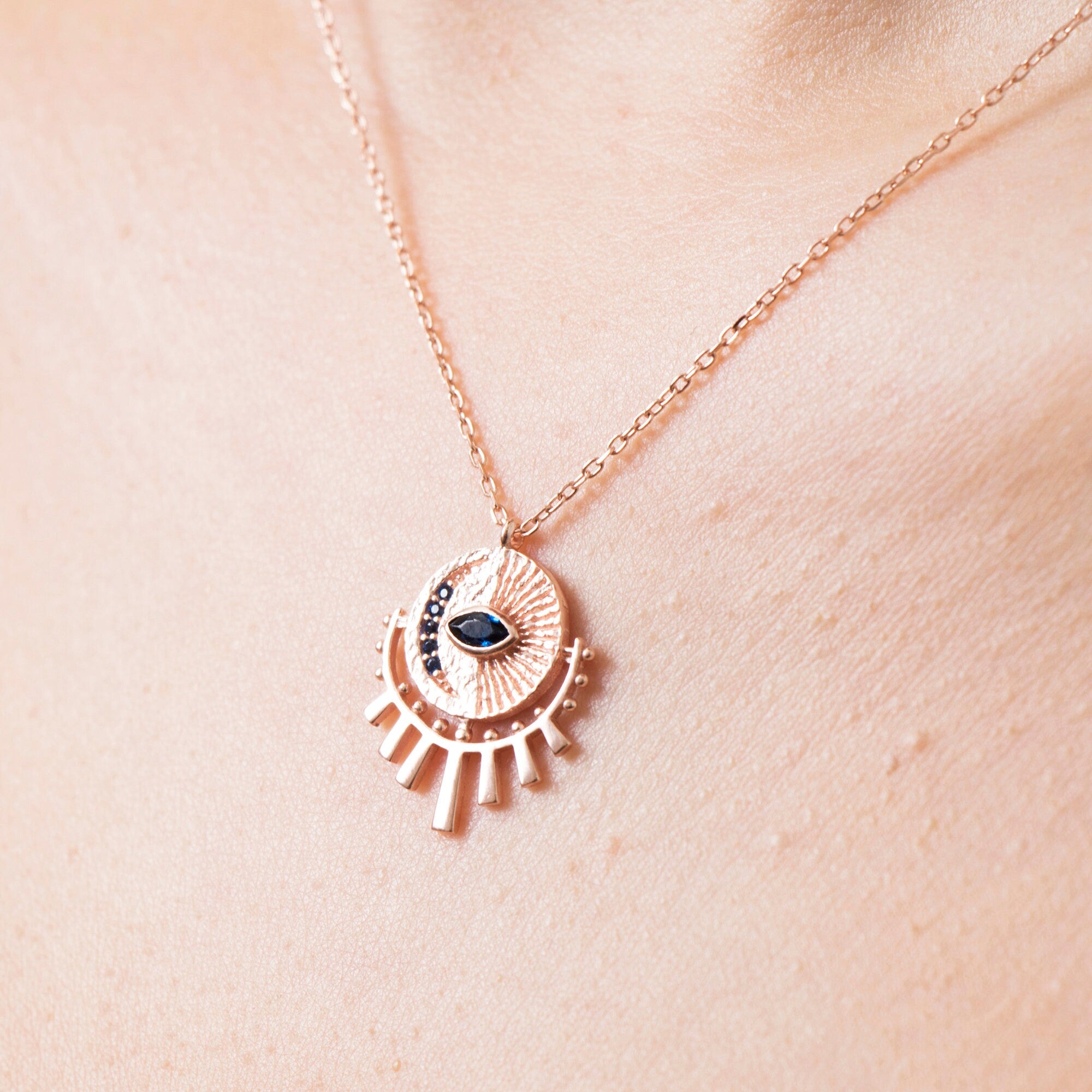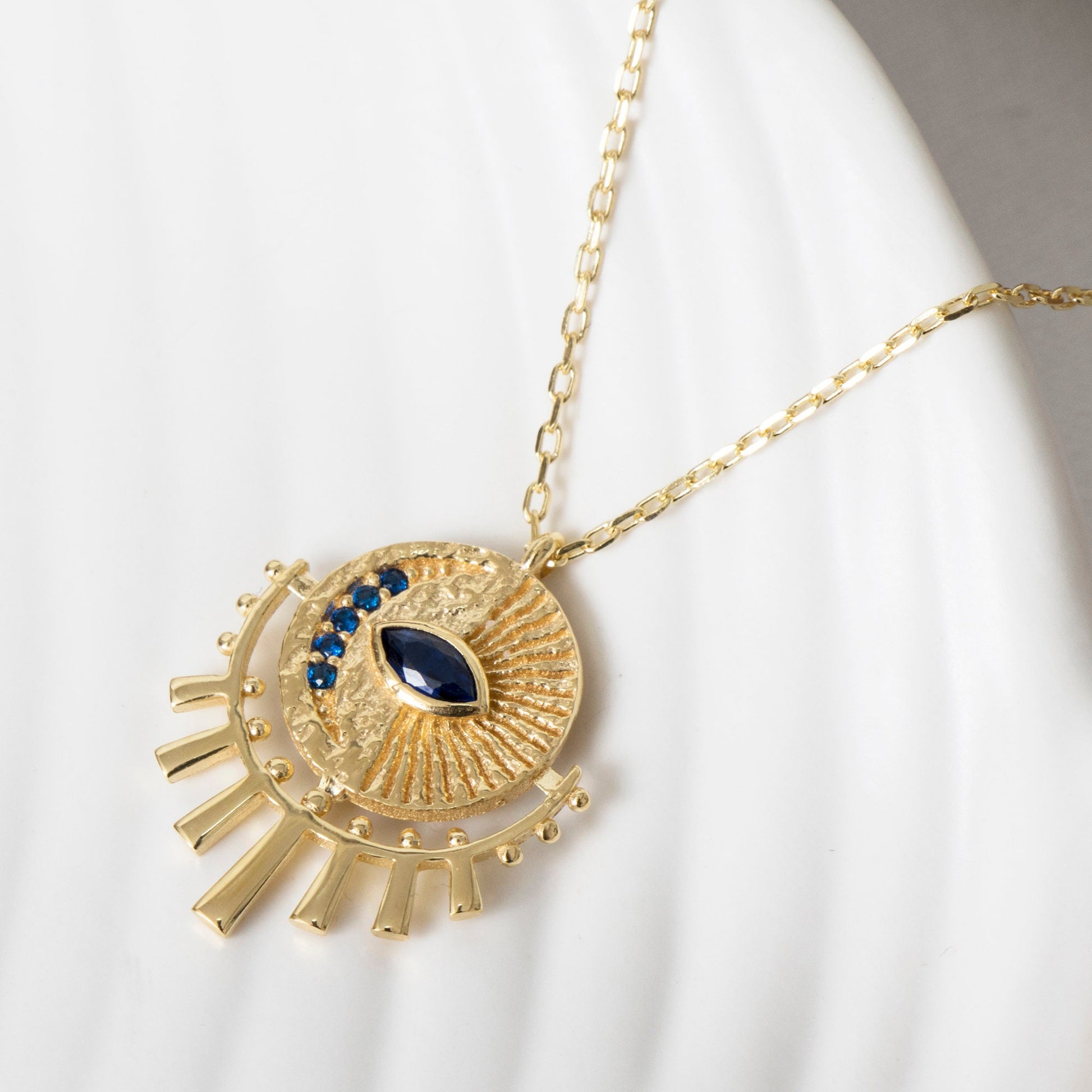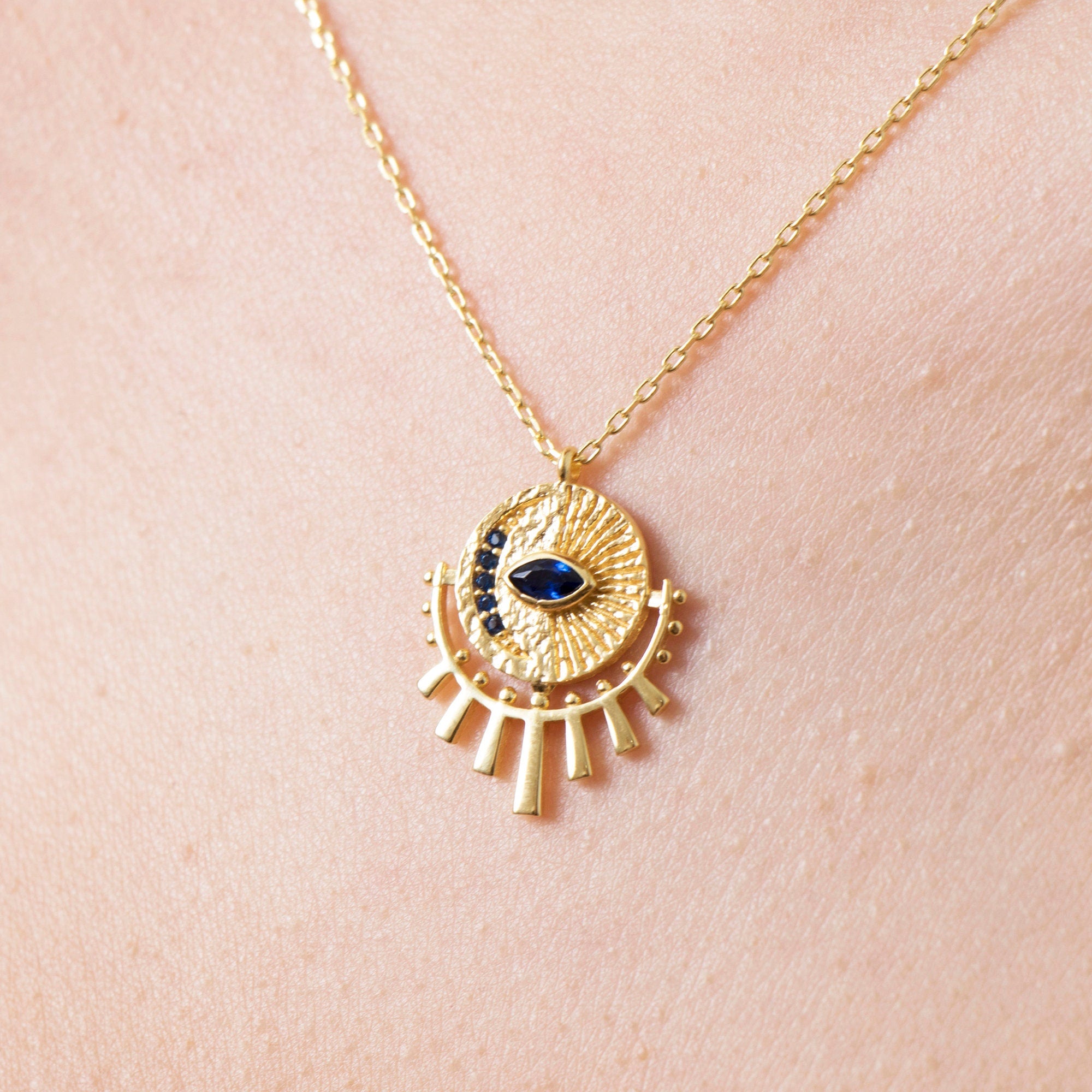 Bring style and positive energy to your everyday look with our Gold Evil Eye Sunburst Necklace. Perfect for gifting or wearing yourself, this dainty necklace combines celestial charm with protective symbolism.