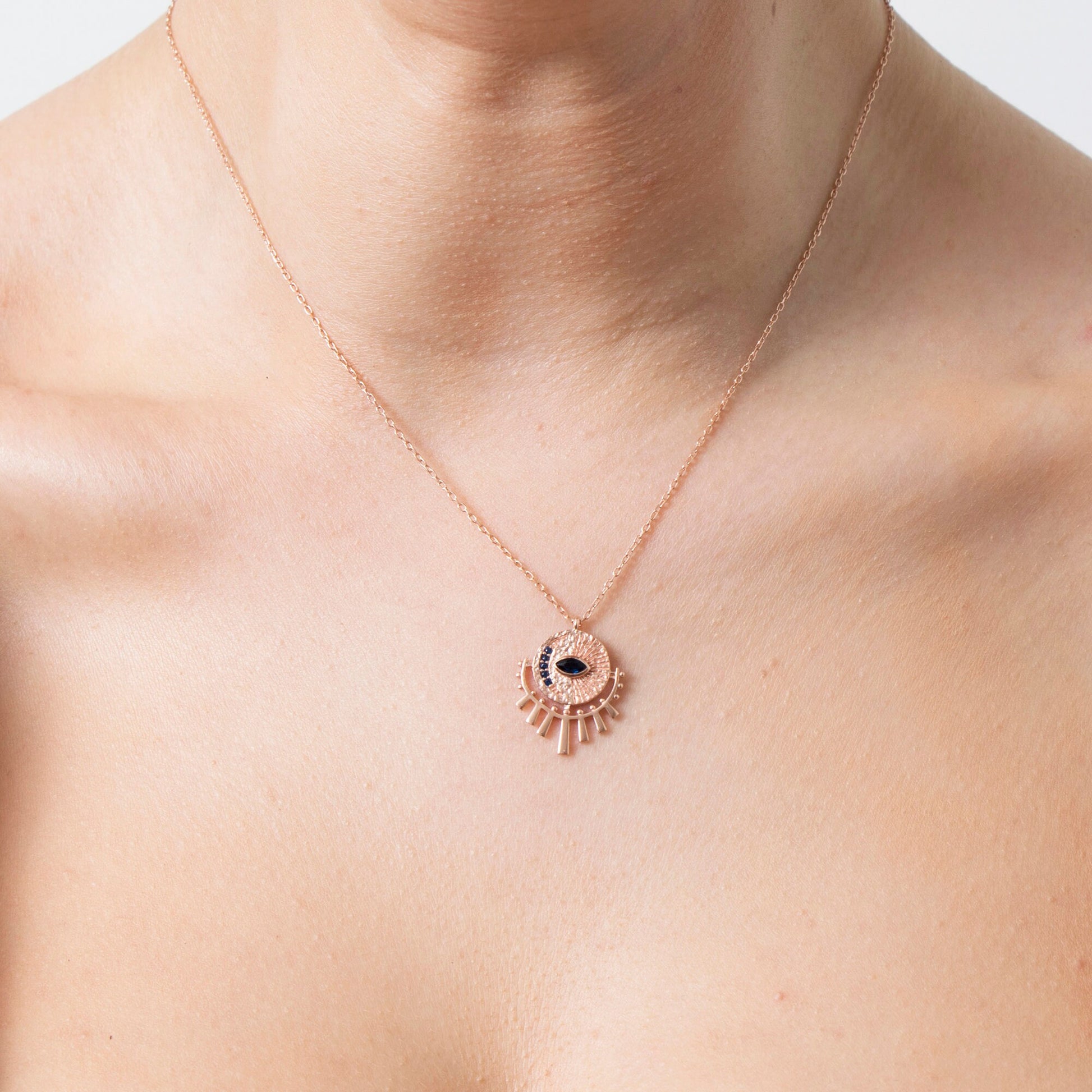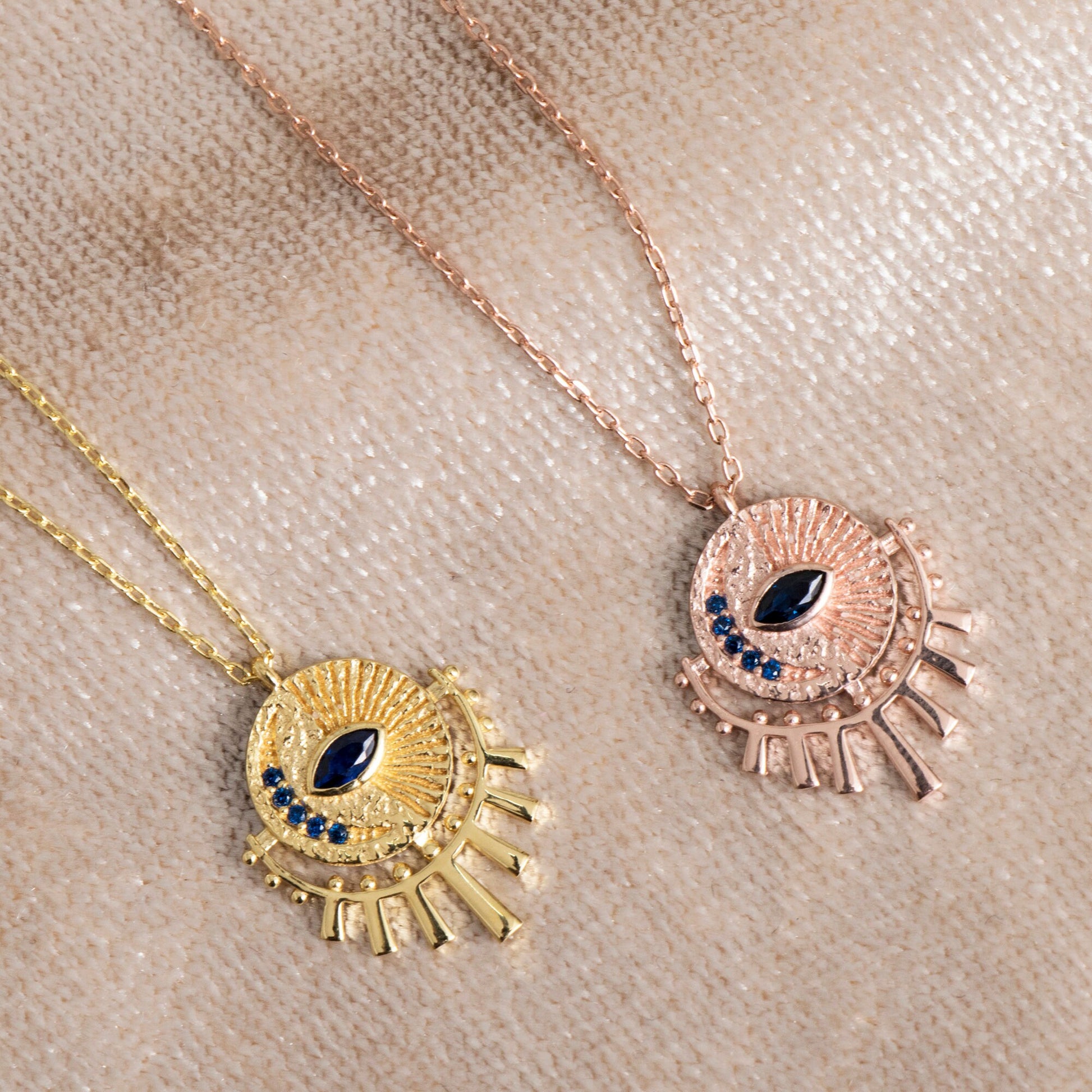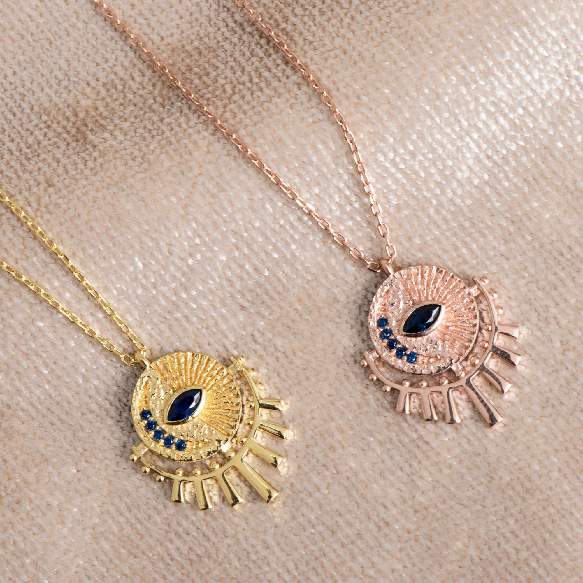 Bring style and positive energy to your everyday look with our Gold Evil Eye Sunburst Necklace. Perfect for gifting or wearing yourself, this dainty necklace combines celestial charm with protective symbolism.