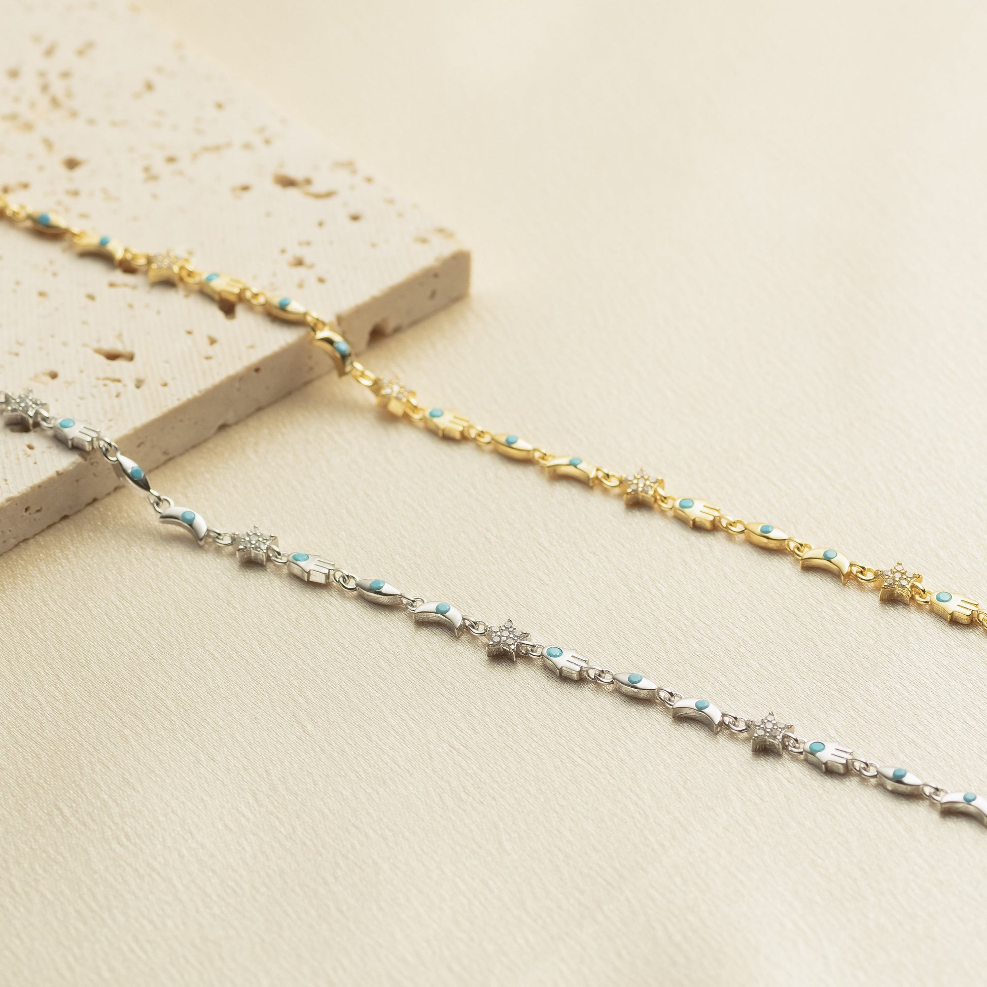 Crafted in 14K gold vermeil (thick gold over sterling silver), this bracelet is hypoallergenic, tarnish-resistant, and designed for daily wear. The perfect blend of color and sparkle, it’s ideal for layering or gifting to someone special as a symbol of love and protection.