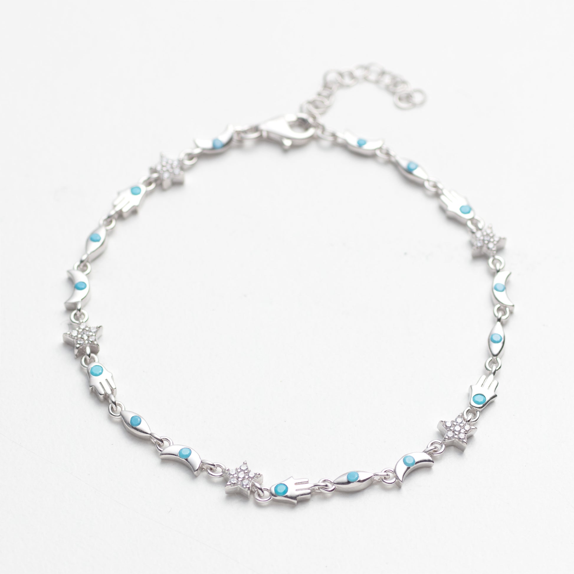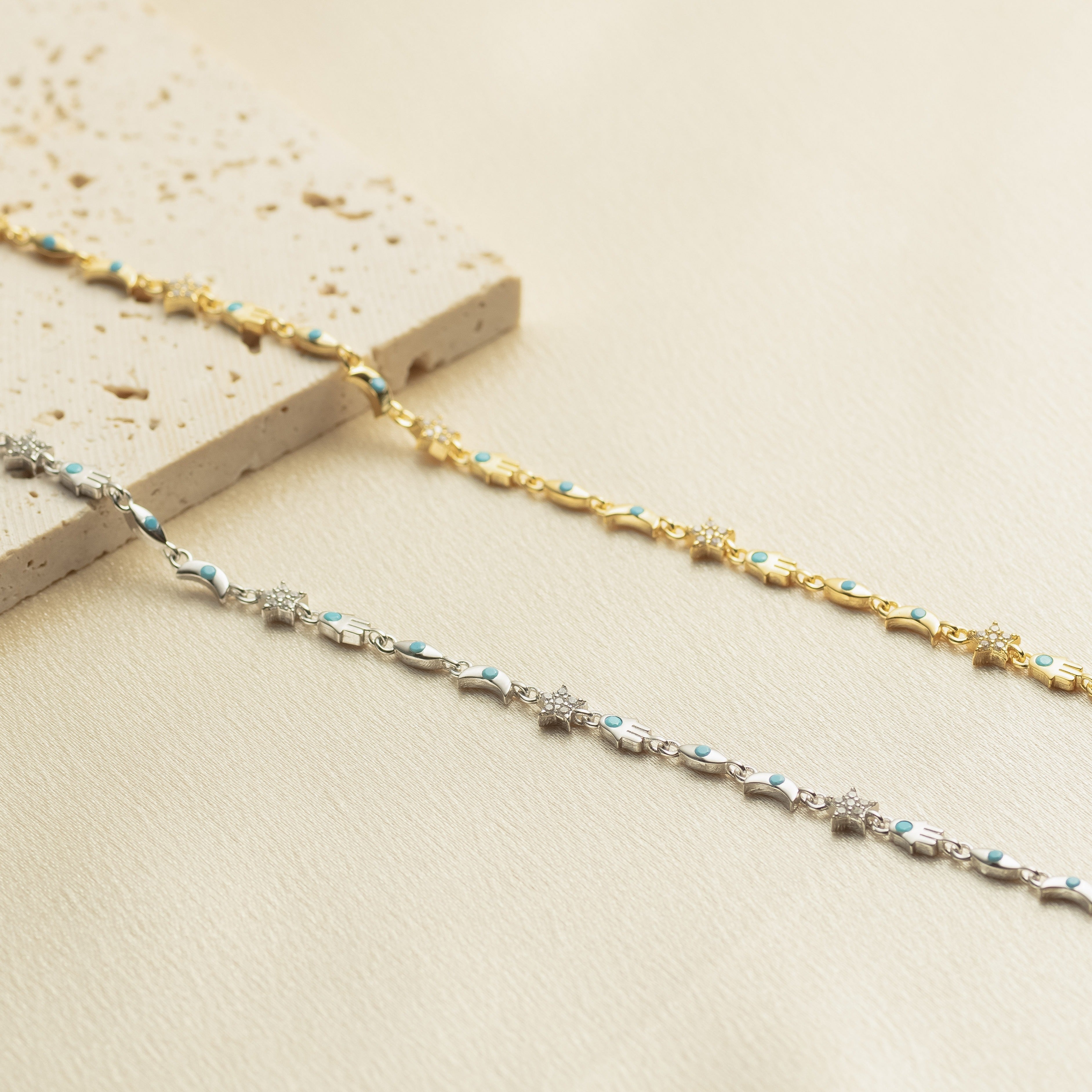 Details: • Material: 14K Gold Vermeil (over 925 sterling silver) • Charms: Turquoise enamel Hamsa and CZ stars • Length: Adjustable (6.5” + 1.5” extender) • Closure: Lobster clasp • Hypoallergenic & tarnish-resistant • Comes in a gift-ready jewelry box