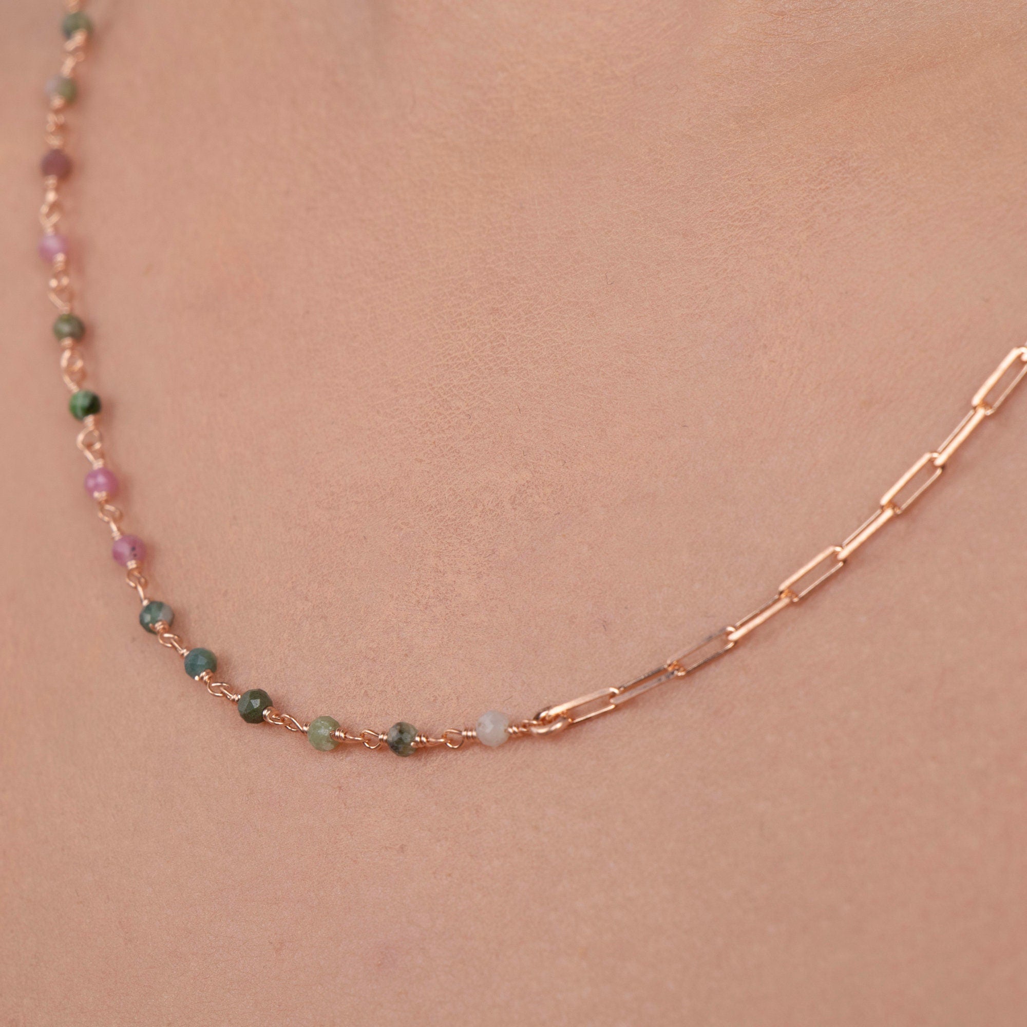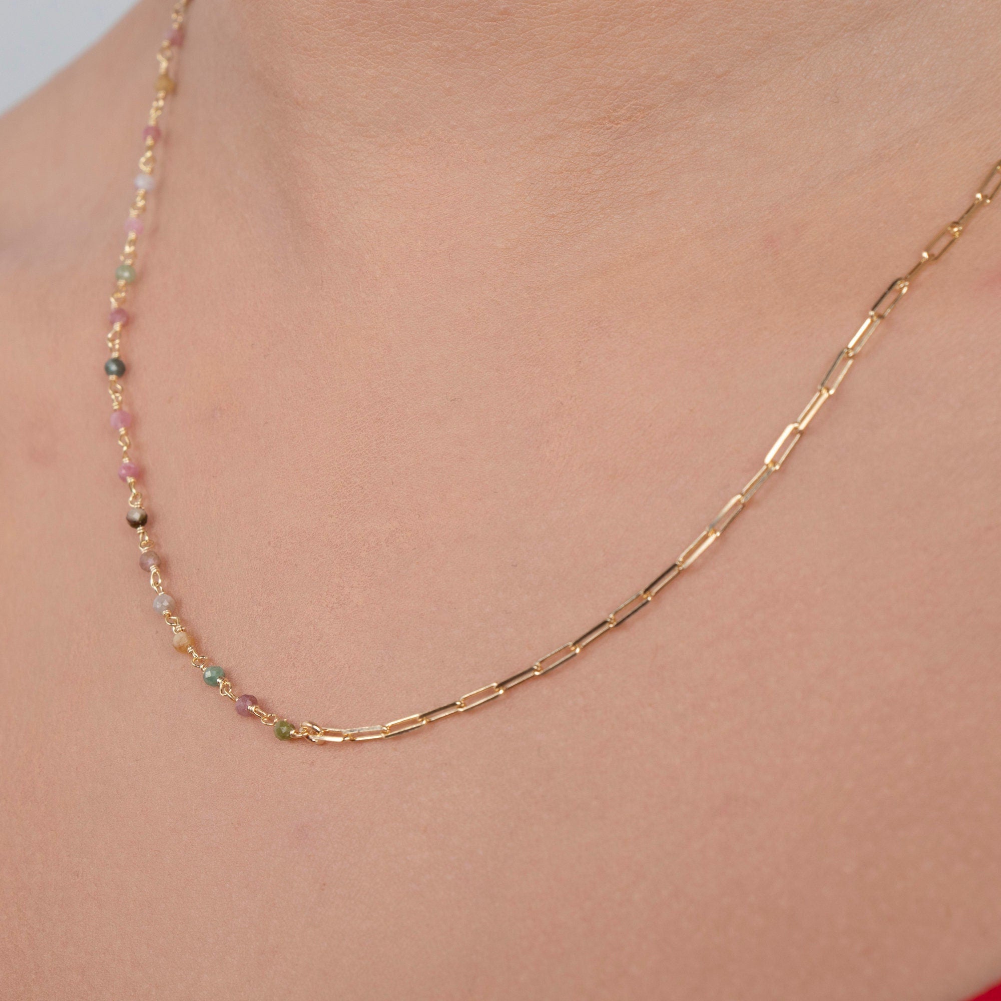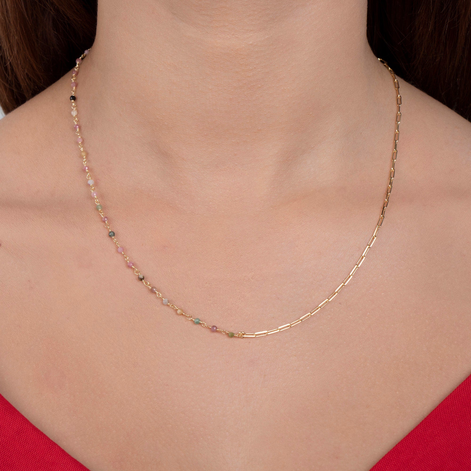 Add a subtle pop of color to your everyday look with our Dainty Tourmaline Beaded Chain Necklace. This delicate necklace features vibrant tourmaline beads on a fine chain, creating a minimalist yet eye-catching piece perfect for layering or wearing alone. Ideal as a thoughtful gift or a personal treat, it combines elegance with meaningful gemstone charm.